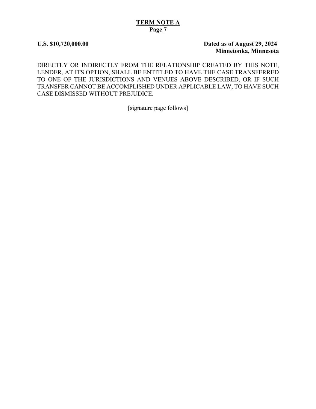 TERM NOTE A Page 7 U.S. $10,720,000.00 Dated as of August 29, 2024 Minnetonka, Minnesota DIRECTLY OR INDIRECTLY FROM THE RELATIONSHIP CREATED BY THIS NOTE, LENDER, AT ITS OPTION, SHALL BE ENTITLED TO HAVE THE CASE TRANSFERRED TO ONE OF THE JURISDICTIONS AND VENUES ABOVE DESCRIBED, OR IF SUCH TRANSFER CANNOT BE ACCOMPLISHED UNDER APPLICABLE LAW, TO HAVE SUCH CASE DISMISSED WITHOUT PREJUDICE. [signature page follows]