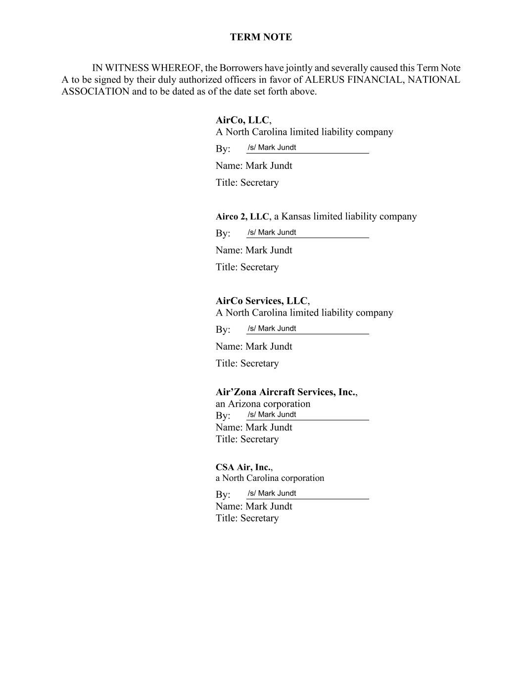 TERM NOTE IN WITNESS WHEREOF, the Borrowers have jointly and severally caused this Term Note A to be signed by their duly authorized officers in favor of ALERUS FINANCIAL, NATIONAL ASSOCIATION and to be dated as of the date set forth above. AirCo, LLC, A North Carolina limited liability company By: Name: Mark Jundt Title: Secretary Airco 2, LLC, a Kansas limited liability company By: Name: Mark Jundt Title: Secretary AirCo Services, LLC, A North Carolina limited liability company By: Name: Mark Jundt Title: Secretary Air’Zona Aircraft Services, Inc., an Arizona corporation By: Name: Mark Jundt Title: Secretary CSA Air, Inc., a North Carolina corporation By: Name: Mark Jundt Title: Secretary /s/ Mark Jundt /s/ Mark Jundt /s/ Mark Jundt /s/ Mark Jundt /s/ Mark Jundt