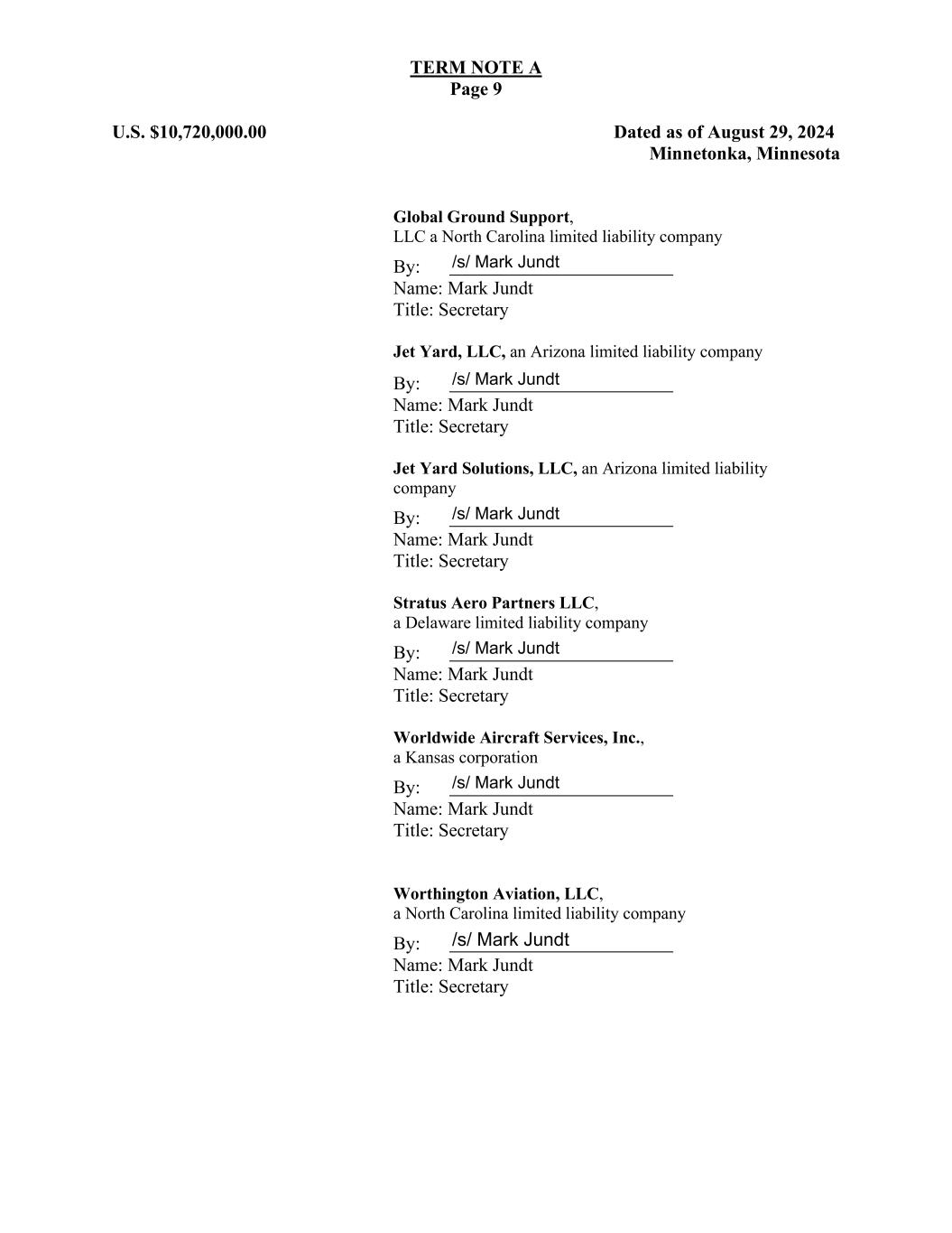 TERM NOTE A Page 9 U.S. $10,720,000.00 Dated as of August 29, 2024 Minnetonka, Minnesota Global Ground Support, LLC a North Carolina limited liability company By: Name: Mark Jundt Title: Secretary Jet Yard, LLC, an Arizona limited liability company By: Name: Mark Jundt Title: Secretary Jet Yard Solutions, LLC, an Arizona limited liability company By: Name: Mark Jundt Title: Secretary Stratus Aero Partners LLC, a Delaware limited liability company By: Name: Mark Jundt Title: Secretary Worldwide Aircraft Services, Inc., a Kansas corporation By: Name: Mark Jundt Title: Secretary Worthington Aviation, LLC, a North Carolina limited liability company By: Name: Mark Jundt Title: Secretary /s/ Mark Jundt /s/ Mark Jundt /s/ Mark Jundt /s/ Mark Jundt /s/ Mark Jundt /s/ Mark Jundt