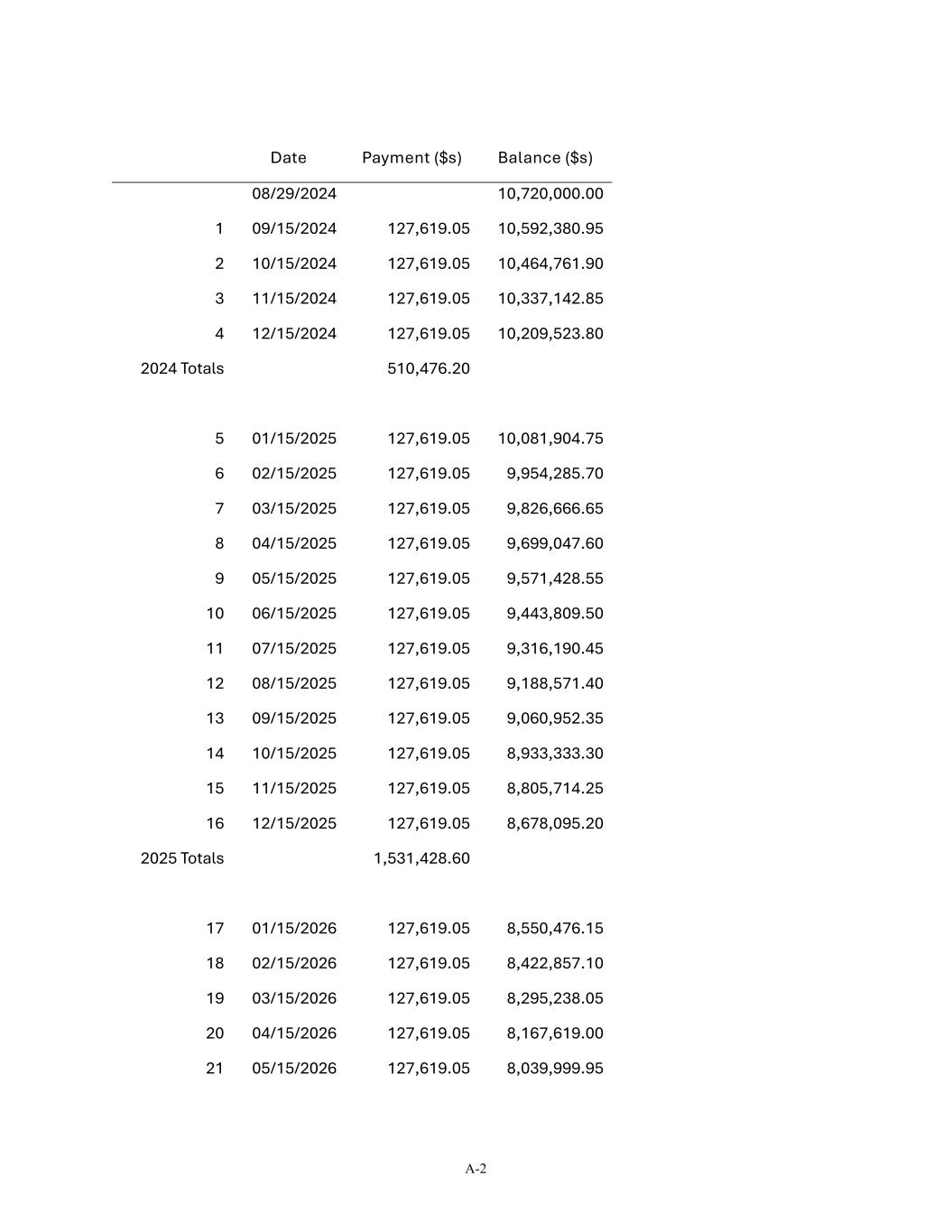 A-2 Date Payment ($s) Balance ($s) 08/29/2024 10,720,000.00 1 09/15/2024 127,619.05 10,592,380.95 2 10/15/2024 127,619.05 10,464,761.90 3 11/15/2024 127,619.05 10,337,142.85 4 12/15/2024 127,619.05 10,209,523.80 2024 Totals 510,476.20 5 01/15/2025 127,619.05 10,081,904.75 6 02/15/2025 127,619.05 9,954,285.70 7 03/15/2025 127,619.05 9,826,666.65 8 04/15/2025 127,619.05 9,699,047.60 9 05/15/2025 127,619.05 9,571,428.55 10 06/15/2025 127,619.05 9,443,809.50 11 07/15/2025 127,619.05 9,316,190.45 12 08/15/2025 127,619.05 9,188,571.40 13 09/15/2025 127,619.05 9,060,952.35 14 10/15/2025 127,619.05 8,933,333.30 15 11/15/2025 127,619.05 8,805,714.25 16 12/15/2025 127,619.05 8,678,095.20 2025 Totals 1,531,428.60 17 01/15/2026 127,619.05 8,550,476.15 18 02/15/2026 127,619.05 8,422,857.10 19 03/15/2026 127,619.05 8,295,238.05 20 04/15/2026 127,619.05 8,167,619.00 21 05/15/2026 127,619.05 8,039,999.95