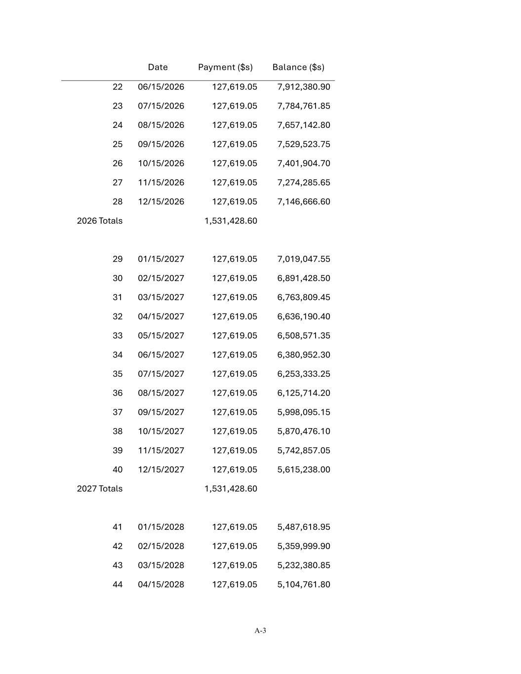 A-3 Date Payment ($s) Balance ($s) 22 06/15/2026 127,619.05 7,912,380.90 23 07/15/2026 127,619.05 7,784,761.85 24 08/15/2026 127,619.05 7,657,142.80 25 09/15/2026 127,619.05 7,529,523.75 26 10/15/2026 127,619.05 7,401,904.70 27 11/15/2026 127,619.05 7,274,285.65 28 12/15/2026 127,619.05 7,146,666.60 2026 Totals 1,531,428.60 29 01/15/2027 127,619.05 7,019,047.55 30 02/15/2027 127,619.05 6,891,428.50 31 03/15/2027 127,619.05 6,763,809.45 32 04/15/2027 127,619.05 6,636,190.40 33 05/15/2027 127,619.05 6,508,571.35 34 06/15/2027 127,619.05 6,380,952.30 35 07/15/2027 127,619.05 6,253,333.25 36 08/15/2027 127,619.05 6,125,714.20 37 09/15/2027 127,619.05 5,998,095.15 38 10/15/2027 127,619.05 5,870,476.10 39 11/15/2027 127,619.05 5,742,857.05 40 12/15/2027 127,619.05 5,615,238.00 2027 Totals 1,531,428.60 41 01/15/2028 127,619.05 5,487,618.95 42 02/15/2028 127,619.05 5,359,999.90 43 03/15/2028 127,619.05 5,232,380.85 44 04/15/2028 127,619.05 5,104,761.80