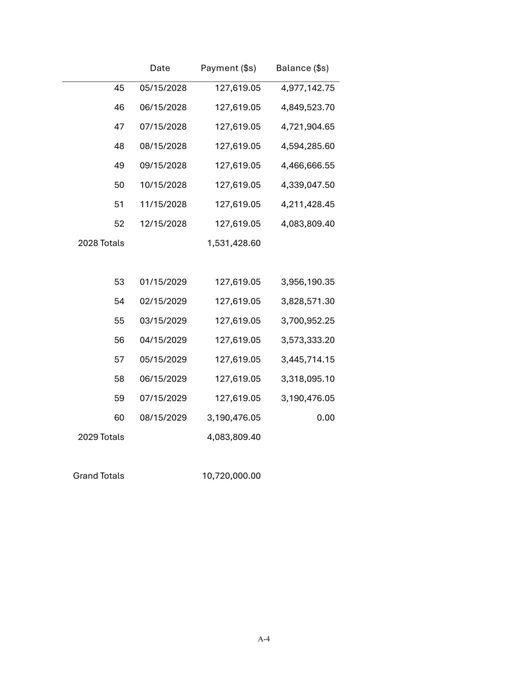 A-4 Date Payment ($s) Balance ($s) 45 05/15/2028 127,619.05 4,977,142.75 46 06/15/2028 127,619.05 4,849,523.70 47 07/15/2028 127,619.05 4,721,904.65 48 08/15/2028 127,619.05 4,594,285.60 49 09/15/2028 127,619.05 4,466,666.55 50 10/15/2028 127,619.05 4,339,047.50 51 11/15/2028 127,619.05 4,211,428.45 52 12/15/2028 127,619.05 4,083,809.40 2028 Totals 1,531,428.60 53 01/15/2029 127,619.05 3,956,190.35 54 02/15/2029 127,619.05 3,828,571.30 55 03/15/2029 127,619.05 3,700,952.25 56 04/15/2029 127,619.05 3,573,333.20 57 05/15/2029 127,619.05 3,445,714.15 58 06/15/2029 127,619.05 3,318,095.10 59 07/15/2029 127,619.05 3,190,476.05 60 08/15/2029 3,190,476.05 0.00 2029 Totals 4,083,809.40 Grand Totals 10,720,000.00