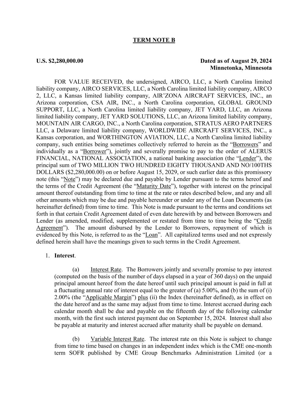 TERM NOTE B U.S. $2,280,000.00 Dated as of August 29, 2024 Minnetonka, Minnesota FOR VALUE RECEIVED, the undersigned, AIRCO, LLC, a North Carolina limited liability company, AIRCO SERVICES, LLC, a North Carolina limited liability company, AIRCO 2, LLC, a Kansas limited liability company, AIR’ZONA AIRCRAFT SERVICES, INC., an Arizona corporation, CSA AIR, INC., a North Carolina corporation, GLOBAL GROUND SUPPORT, LLC, a North Carolina limited liability company, JET YARD, LLC, an Arizona limited liability company, JET YARD SOLUTIONS, LLC, an Arizona limited liability company, MOUNTAIN AIR CARGO, INC., a North Carolina corporation, STRATUS AERO PARTNERS LLC, a Delaware limited liability company, WORLDWIDE AIRCRAFT SERVICES, INC., a Kansas corporation, and WORTHINGTON AVIATION, LLC, a North Carolina limited liability company, such entities being sometimes collectively referred to herein as the “Borrowers” and individually as a “Borrower”), jointly and severally promise to pay to the order of ALERUS FINANCIAL, NATIONAL ASSOCIATION, a national banking association (the “Lender”), the principal sum of TWO MILLION TWO HUNDRED EIGHTY THOUSAND AND NO/100THS DOLLARS ($2,280,000.00) on or before August 15, 2029, or such earlier date as this promissory note (this “Note”) may be declared due and payable by Lender pursuant to the terms hereof and the terms of the Credit Agreement (the “Maturity Date”), together with interest on the principal amount thereof outstanding from time to time at the rate or rates described below, and any and all other amounts which may be due and payable hereunder or under any of the Loan Documents (as hereinafter defined) from time to time. This Note is made pursuant to the terms and conditions set forth in that certain Credit Agreement dated of even date herewith by and between Borrowers and Lender (as amended, modified, supplemented or restated from time to time being the “Credit Agreement”). The amount disbursed by the Lender to Borrowers, repayment of which is evidenced by this Note, is referred to as the “Loan”. All capitalized terms used and not expressly defined herein shall have the meanings given to such terms in the Credit Agreement. 1. Interest. (a) Interest Rate. The Borrowers jointly and severally promise to pay interest (computed on the basis of the number of days elapsed in a year of 360 days) on the unpaid principal amount hereof from the date hereof until such principal amount is paid in full at a fluctuating annual rate of interest equal to the greater of (a) 5.00%, and (b) the sum of (i) 2.00% (the “Applicable Margin”) plus (ii) the Index (hereinafter defined), as in effect on the date hereof and as the same may adjust from time to time. Interest accrued during each calendar month shall be due and payable on the fifteenth day of the following calendar month, with the first such interest payment due on September 15, 2024. Interest shall also be payable at maturity and interest accrued after maturity shall be payable on demand. (b) Variable Interest Rate. The interest rate on this Note is subject to change from time to time based on changes in an independent index which is the CME one-month term SOFR published by CME Group Benchmarks Administration Limited (or a