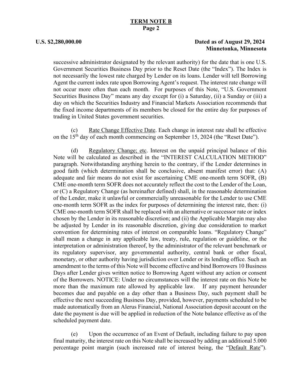 TERM NOTE B Page 2 U.S. $2,280,000.00 Dated as of August 29, 2024 Minnetonka, Minnesota successive administrator designated by the relevant authority) for the date that is one U.S. Government Securities Business Day prior to the Reset Date (the “Index”). The Index is not necessarily the lowest rate charged by Lender on its loans. Lender will tell Borrowing Agent the current index rate upon Borrowing Agent’s request. The interest rate change will not occur more often than each month. For purposes of this Note, “U.S. Government Securities Business Day” means any day except for (i) a Saturday, (ii) a Sunday or (iii) a day on which the Securities Industry and Financial Markets Association recommends that the fixed income departments of its members be closed for the entire day for purposes of trading in United States government securities. (c) Rate Change Effective Date. Each change in interest rate shall be effective on the 15th day of each month commencing on September 15, 2024 (the “Reset Date”). (d) Regulatory Change; etc. Interest on the unpaid principal balance of this Note will be calculated as described in the “INTEREST CALCULATION METHOD” paragraph. Notwithstanding anything herein to the contrary, if the Lender determines in good faith (which determination shall be conclusive, absent manifest error) that: (A) adequate and fair means do not exist for ascertaining CME one-month term SOFR, (B) CME one-month term SOFR does not accurately reflect the cost to the Lender of the Loan, or (C) a Regulatory Change (as hereinafter defined) shall, in the reasonable determination of the Lender, make it unlawful or commercially unreasonable for the Lender to use CME one-month term SOFR as the index for purposes of determining the interest rate, then: (i) CME one-month term SOFR shall be replaced with an alternative or successor rate or index chosen by the Lender in its reasonable discretion; and (ii) the Applicable Margin may also be adjusted by Lender in its reasonable discretion, giving due consideration to market convention for determining rates of interest on comparable loans. “Regulatory Change” shall mean a change in any applicable law, treaty, rule, regulation or guideline, or the interpretation or administration thereof, by the administrator of the relevant benchmark or its regulatory supervisor, any governmental authority, central bank or other fiscal, monetary, or other authority having jurisdiction over Lender or its lending office. Such an amendment to the terms of this Note will become effective and bind Borrowers 10 Business Days after Lender gives written notice to Borrowing Agent without any action or consent of the Borrowers. NOTICE: Under no circumstances will the interest rate on this Note be more than the maximum rate allowed by applicable law. If any payment hereunder becomes due and payable on a day other than a Business Day, such payment shall be effective the next succeeding Business Day, provided, however, payments scheduled to be made automatically from an Alerus Financial, National Association deposit account on the date the payment is due will be applied in reduction of the Note balance effective as of the scheduled payment date. (e) Upon the occurrence of an Event of Default, including failure to pay upon final maturity, the interest rate on this Note shall be increased by adding an additional 5.000 percentage point margin (such increased rate of interest being, the “Default Rate”).