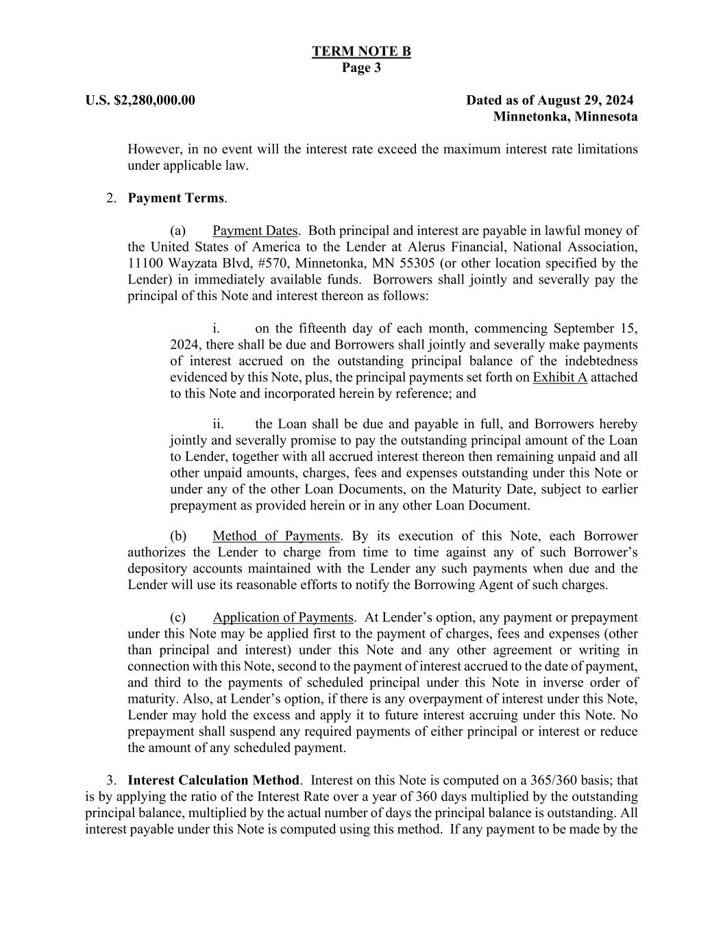 TERM NOTE B Page 3 U.S. $2,280,000.00 Dated as of August 29, 2024 Minnetonka, Minnesota However, in no event will the interest rate exceed the maximum interest rate limitations under applicable law. 2. Payment Terms. (a) Payment Dates. Both principal and interest are payable in lawful money of the United States of America to the Lender at Alerus Financial, National Association, 11100 Wayzata Blvd, #570, Minnetonka, MN 55305 (or other location specified by the Lender) in immediately available funds. Borrowers shall jointly and severally pay the principal of this Note and interest thereon as follows: i. on the fifteenth day of each month, commencing September 15, 2024, there shall be due and Borrowers shall jointly and severally make payments of interest accrued on the outstanding principal balance of the indebtedness evidenced by this Note, plus, the principal payments set forth on Exhibit A attached to this Note and incorporated herein by reference; and ii. the Loan shall be due and payable in full, and Borrowers hereby jointly and severally promise to pay the outstanding principal amount of the Loan to Lender, together with all accrued interest thereon then remaining unpaid and all other unpaid amounts, charges, fees and expenses outstanding under this Note or under any of the other Loan Documents, on the Maturity Date, subject to earlier prepayment as provided herein or in any other Loan Document. (b) Method of Payments. By its execution of this Note, each Borrower authorizes the Lender to charge from time to time against any of such Borrower’s depository accounts maintained with the Lender any such payments when due and the Lender will use its reasonable efforts to notify the Borrowing Agent of such charges. (c) Application of Payments. At Lender’s option, any payment or prepayment under this Note may be applied first to the payment of charges, fees and expenses (other than principal and interest) under this Note and any other agreement or writing in connection with this Note, second to the payment of interest accrued to the date of payment, and third to the payments of scheduled principal under this Note in inverse order of maturity. Also, at Lender’s option, if there is any overpayment of interest under this Note, Lender may hold the excess and apply it to future interest accruing under this Note. No prepayment shall suspend any required payments of either principal or interest or reduce the amount of any scheduled payment. 3. Interest Calculation Method. Interest on this Note is computed on a 365/360 basis; that is by applying the ratio of the Interest Rate over a year of 360 days multiplied by the outstanding principal balance, multiplied by the actual number of days the principal balance is outstanding. All interest payable under this Note is computed using this method. If any payment to be made by the
