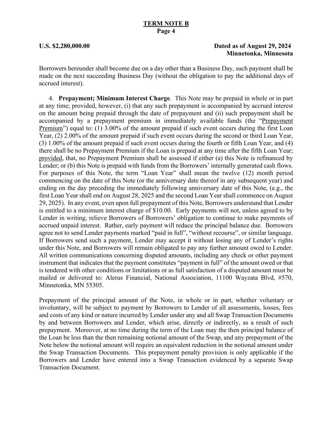 TERM NOTE B Page 4 U.S. $2,280,000.00 Dated as of August 29, 2024 Minnetonka, Minnesota Borrowers hereunder shall become due on a day other than a Business Day, such payment shall be made on the next succeeding Business Day (without the obligation to pay the additional days of accrued interest). 4. Prepayment; Minimum Interest Charge. This Note may be prepaid in whole or in part at any time; provided, however, (i) that any such prepayment is accompanied by accrued interest on the amount being prepaid through the date of prepayment and (ii) such prepayment shall be accompanied by a prepayment premium in immediately available funds (the “Prepayment Premium”) equal to: (1) 3.00% of the amount prepaid if such event occurs during the first Loan Year, (2) 2.00% of the amount prepaid if such event occurs during the second or third Loan Year, (3) 1.00% of the amount prepaid if such event occurs during the fourth or fifth Loan Year, and (4) there shall be no Prepayment Premium if the Loan is prepaid at any time after the fifth Loan Year; provided, that, no Prepayment Premium shall be assessed if either (a) this Note is refinanced by Lender; or (b) this Note is prepaid with funds from the Borrowers’ internally generated cash flows. For purposes of this Note, the term “Loan Year” shall mean the twelve (12) month period commencing on the date of this Note (or the anniversary date thereof in any subsequent year) and ending on the day preceding the immediately following anniversary date of this Note, (e.g., the first Loan Year shall end on August 28, 2025 and the second Loan Year shall commence on August 29, 2025). In any event, even upon full prepayment of this Note, Borrowers understand that Lender is entitled to a minimum interest charge of $10.00. Early payments will not, unless agreed to by Lender in writing, relieve Borrowers of Borrowers’ obligation to continue to make payments of accrued unpaid interest. Rather, early payment will reduce the principal balance due. Borrowers agree not to send Lender payments marked “paid in full”, “without recourse”, or similar language. If Borrowers send such a payment, Lender may accept it without losing any of Lender’s rights under this Note, and Borrowers will remain obligated to pay any further amount owed to Lender. All written communications concerning disputed amounts, including any check or other payment instrument that indicates that the payment constitutes “payment in full” of the amount owed or that is tendered with other conditions or limitations or as full satisfaction of a disputed amount must be mailed or delivered to: Alerus Financial, National Association, 11100 Wayzata Blvd, #570, Minnetonka, MN 55305. Prepayment of the principal amount of the Note, in whole or in part, whether voluntary or involuntary, will be subject to payment by Borrowers to Lender of all assessments, losses, fees and costs of any kind or nature incurred by Lender under any and all Swap Transaction Documents by and between Borrowers and Lender, which arise, directly or indirectly, as a result of such prepayment. Moreover, at no time during the term of the Loan may the then principal balance of the Loan be less than the then remaining notional amount of the Swap, and any prepayment of the Note below the notional amount will require an equivalent reduction in the notional amount under the Swap Transaction Documents. This prepayment penalty provision is only applicable if the Borrowers and Lender have entered into a Swap Transaction evidenced by a separate Swap Transaction Document.