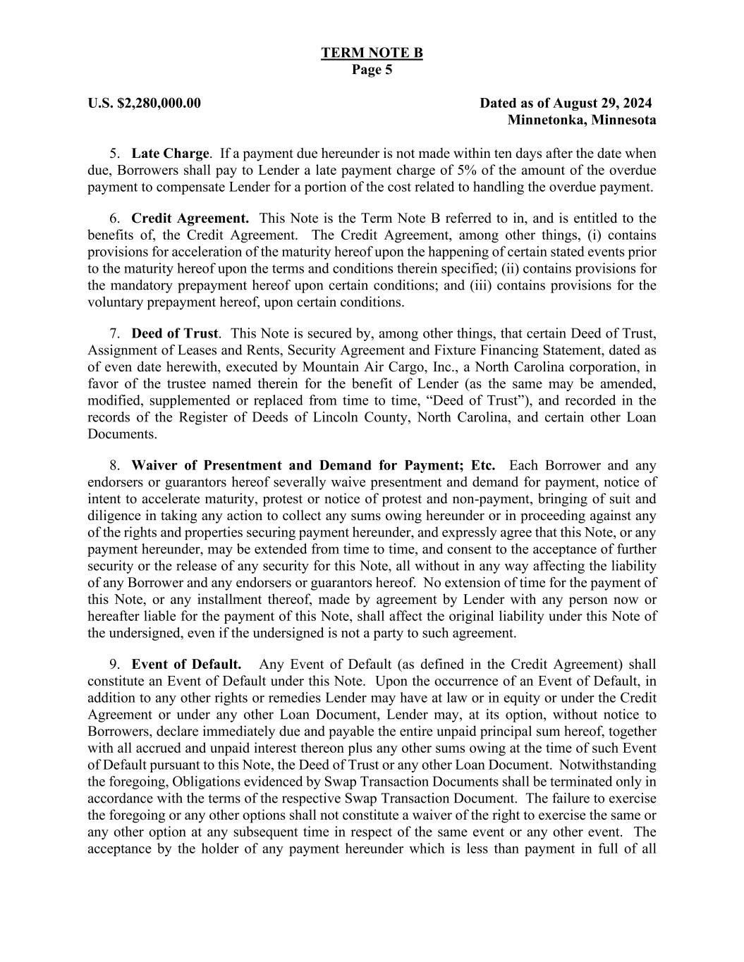 TERM NOTE B Page 5 U.S. $2,280,000.00 Dated as of August 29, 2024 Minnetonka, Minnesota 5. Late Charge. If a payment due hereunder is not made within ten days after the date when due, Borrowers shall pay to Lender a late payment charge of 5% of the amount of the overdue payment to compensate Lender for a portion of the cost related to handling the overdue payment. 6. Credit Agreement. This Note is the Term Note B referred to in, and is entitled to the benefits of, the Credit Agreement. The Credit Agreement, among other things, (i) contains provisions for acceleration of the maturity hereof upon the happening of certain stated events prior to the maturity hereof upon the terms and conditions therein specified; (ii) contains provisions for the mandatory prepayment hereof upon certain conditions; and (iii) contains provisions for the voluntary prepayment hereof, upon certain conditions. 7. Deed of Trust. This Note is secured by, among other things, that certain Deed of Trust, Assignment of Leases and Rents, Security Agreement and Fixture Financing Statement, dated as of even date herewith, executed by Mountain Air Cargo, Inc., a North Carolina corporation, in favor of the trustee named therein for the benefit of Lender (as the same may be amended, modified, supplemented or replaced from time to time, “Deed of Trust”), and recorded in the records of the Register of Deeds of Lincoln County, North Carolina, and certain other Loan Documents. 8. Waiver of Presentment and Demand for Payment; Etc. Each Borrower and any endorsers or guarantors hereof severally waive presentment and demand for payment, notice of intent to accelerate maturity, protest or notice of protest and non-payment, bringing of suit and diligence in taking any action to collect any sums owing hereunder or in proceeding against any of the rights and properties securing payment hereunder, and expressly agree that this Note, or any payment hereunder, may be extended from time to time, and consent to the acceptance of further security or the release of any security for this Note, all without in any way affecting the liability of any Borrower and any endorsers or guarantors hereof. No extension of time for the payment of this Note, or any installment thereof, made by agreement by Lender with any person now or hereafter liable for the payment of this Note, shall affect the original liability under this Note of the undersigned, even if the undersigned is not a party to such agreement. 9. Event of Default. Any Event of Default (as defined in the Credit Agreement) shall constitute an Event of Default under this Note. Upon the occurrence of an Event of Default, in addition to any other rights or remedies Lender may have at law or in equity or under the Credit Agreement or under any other Loan Document, Lender may, at its option, without notice to Borrowers, declare immediately due and payable the entire unpaid principal sum hereof, together with all accrued and unpaid interest thereon plus any other sums owing at the time of such Event of Default pursuant to this Note, the Deed of Trust or any other Loan Document. Notwithstanding the foregoing, Obligations evidenced by Swap Transaction Documents shall be terminated only in accordance with the terms of the respective Swap Transaction Document. The failure to exercise the foregoing or any other options shall not constitute a waiver of the right to exercise the same or any other option at any subsequent time in respect of the same event or any other event. The acceptance by the holder of any payment hereunder which is less than payment in full of all