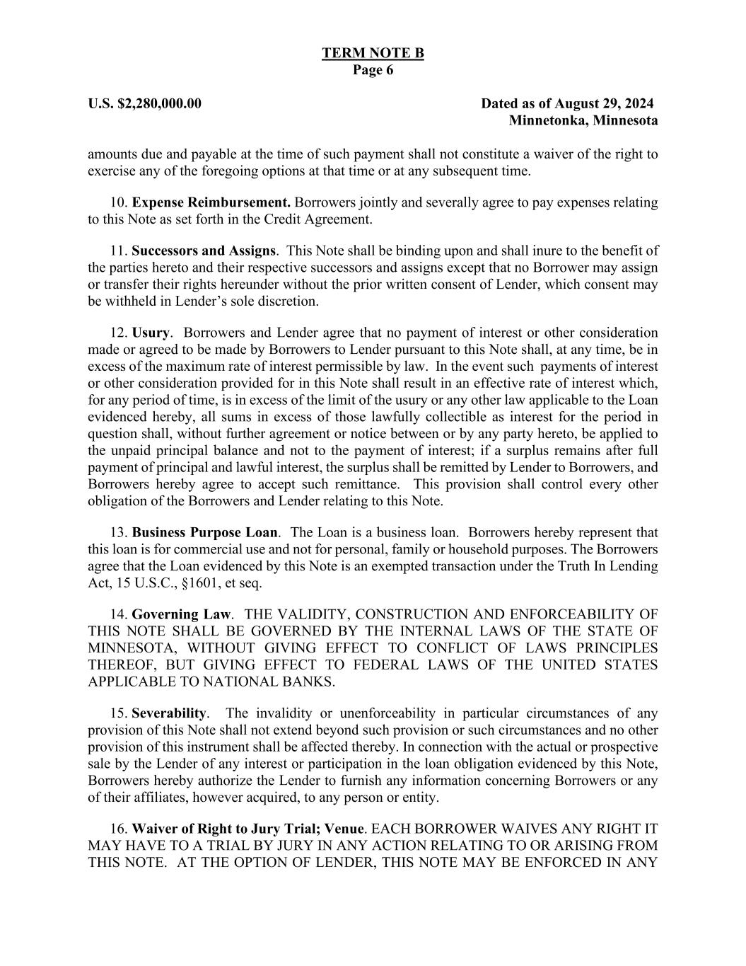 TERM NOTE B Page 6 U.S. $2,280,000.00 Dated as of August 29, 2024 Minnetonka, Minnesota amounts due and payable at the time of such payment shall not constitute a waiver of the right to exercise any of the foregoing options at that time or at any subsequent time. 10. Expense Reimbursement. Borrowers jointly and severally agree to pay expenses relating to this Note as set forth in the Credit Agreement. 11. Successors and Assigns. This Note shall be binding upon and shall inure to the benefit of the parties hereto and their respective successors and assigns except that no Borrower may assign or transfer their rights hereunder without the prior written consent of Lender, which consent may be withheld in Lender’s sole discretion. 12. Usury. Borrowers and Lender agree that no payment of interest or other consideration made or agreed to be made by Borrowers to Lender pursuant to this Note shall, at any time, be in excess of the maximum rate of interest permissible by law. In the event such payments of interest or other consideration provided for in this Note shall result in an effective rate of interest which, for any period of time, is in excess of the limit of the usury or any other law applicable to the Loan evidenced hereby, all sums in excess of those lawfully collectible as interest for the period in question shall, without further agreement or notice between or by any party hereto, be applied to the unpaid principal balance and not to the payment of interest; if a surplus remains after full payment of principal and lawful interest, the surplus shall be remitted by Lender to Borrowers, and Borrowers hereby agree to accept such remittance. This provision shall control every other obligation of the Borrowers and Lender relating to this Note. 13. Business Purpose Loan. The Loan is a business loan. Borrowers hereby represent that this loan is for commercial use and not for personal, family or household purposes. The Borrowers agree that the Loan evidenced by this Note is an exempted transaction under the Truth In Lending Act, 15 U.S.C., §1601, et seq. 14. Governing Law. THE VALIDITY, CONSTRUCTION AND ENFORCEABILITY OF THIS NOTE SHALL BE GOVERNED BY THE INTERNAL LAWS OF THE STATE OF MINNESOTA, WITHOUT GIVING EFFECT TO CONFLICT OF LAWS PRINCIPLES THEREOF, BUT GIVING EFFECT TO FEDERAL LAWS OF THE UNITED STATES APPLICABLE TO NATIONAL BANKS. 15. Severability. The invalidity or unenforceability in particular circumstances of any provision of this Note shall not extend beyond such provision or such circumstances and no other provision of this instrument shall be affected thereby. In connection with the actual or prospective sale by the Lender of any interest or participation in the loan obligation evidenced by this Note, Borrowers hereby authorize the Lender to furnish any information concerning Borrowers or any of their affiliates, however acquired, to any person or entity. 16. Waiver of Right to Jury Trial; Venue. EACH BORROWER WAIVES ANY RIGHT IT MAY HAVE TO A TRIAL BY JURY IN ANY ACTION RELATING TO OR ARISING FROM THIS NOTE. AT THE OPTION OF LENDER, THIS NOTE MAY BE ENFORCED IN ANY