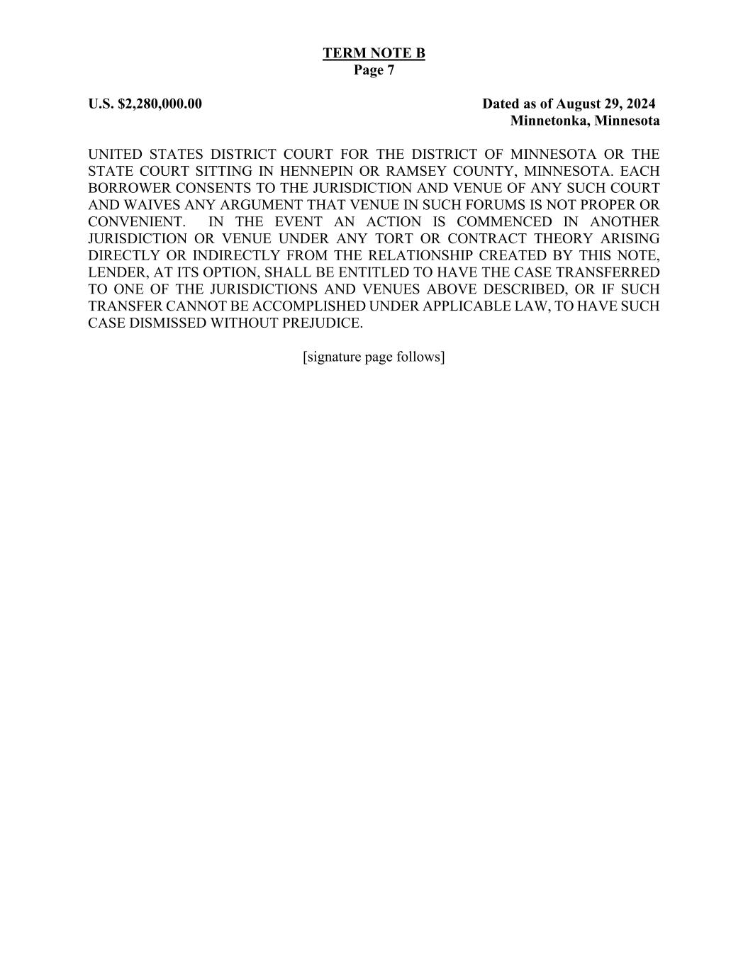 TERM NOTE B Page 7 U.S. $2,280,000.00 Dated as of August 29, 2024 Minnetonka, Minnesota UNITED STATES DISTRICT COURT FOR THE DISTRICT OF MINNESOTA OR THE STATE COURT SITTING IN HENNEPIN OR RAMSEY COUNTY, MINNESOTA. EACH BORROWER CONSENTS TO THE JURISDICTION AND VENUE OF ANY SUCH COURT AND WAIVES ANY ARGUMENT THAT VENUE IN SUCH FORUMS IS NOT PROPER OR CONVENIENT. IN THE EVENT AN ACTION IS COMMENCED IN ANOTHER JURISDICTION OR VENUE UNDER ANY TORT OR CONTRACT THEORY ARISING DIRECTLY OR INDIRECTLY FROM THE RELATIONSHIP CREATED BY THIS NOTE, LENDER, AT ITS OPTION, SHALL BE ENTITLED TO HAVE THE CASE TRANSFERRED TO ONE OF THE JURISDICTIONS AND VENUES ABOVE DESCRIBED, OR IF SUCH TRANSFER CANNOT BE ACCOMPLISHED UNDER APPLICABLE LAW, TO HAVE SUCH CASE DISMISSED WITHOUT PREJUDICE. [signature page follows]