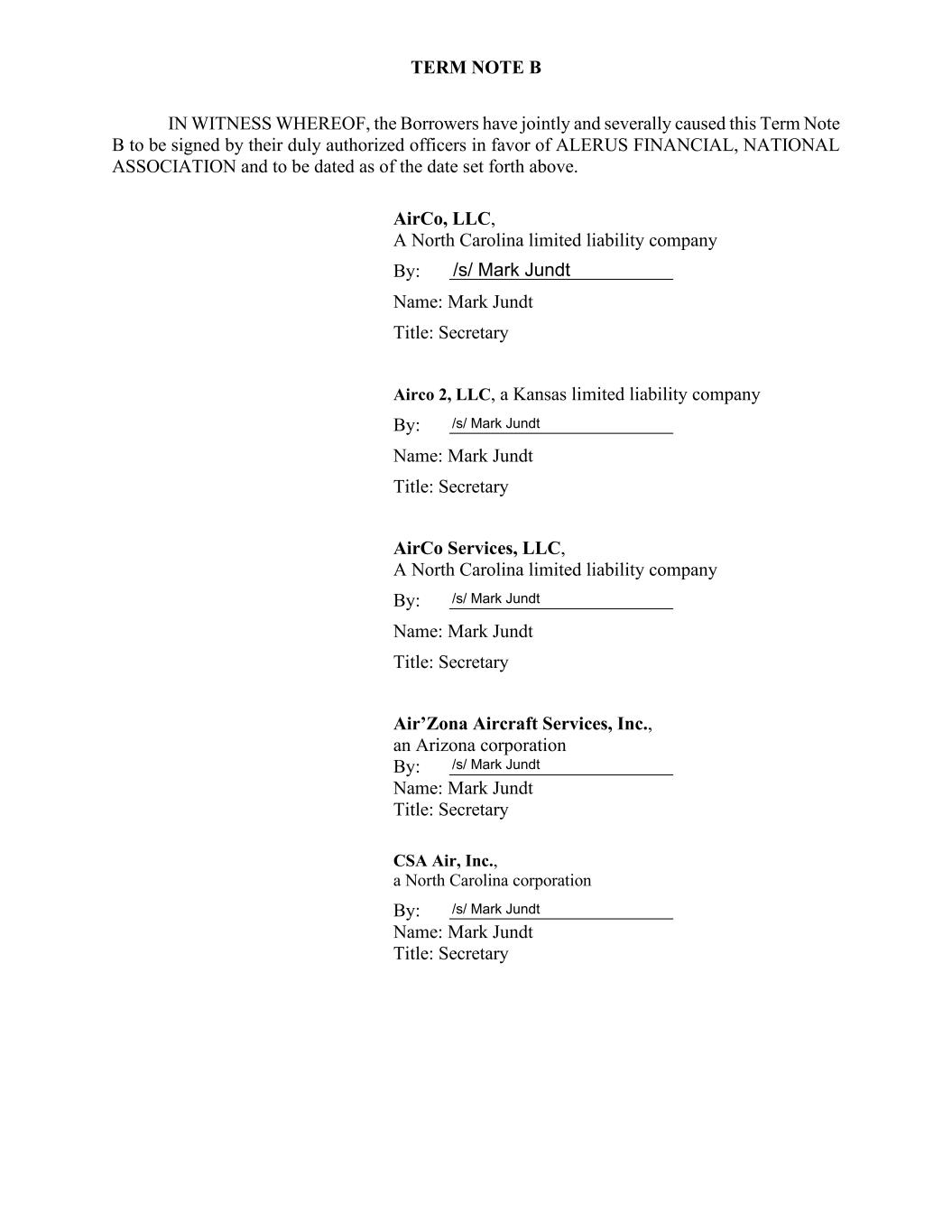 TERM NOTE B IN WITNESS WHEREOF, the Borrowers have jointly and severally caused this Term Note B to be signed by their duly authorized officers in favor of ALERUS FINANCIAL, NATIONAL ASSOCIATION and to be dated as of the date set forth above. AirCo, LLC, A North Carolina limited liability company By: Name: Mark Jundt Title: Secretary Airco 2, LLC, a Kansas limited liability company By: Name: Mark Jundt Title: Secretary AirCo Services, LLC, A North Carolina limited liability company By: Name: Mark Jundt Title: Secretary Air’Zona Aircraft Services, Inc., an Arizona corporation By: Name: Mark Jundt Title: Secretary CSA Air, Inc., a North Carolina corporation By: Name: Mark Jundt Title: Secretary /s/ Mark Jundt /s/ Mark Jundt /s/ Mark Jundt /s/ Mark Jundt /s/ Mark Jundt