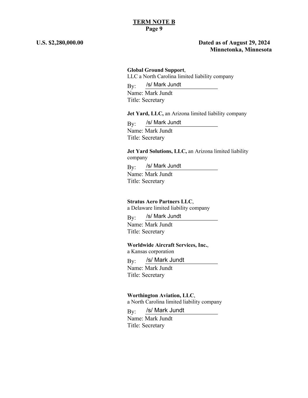 TERM NOTE B Page 9 U.S. $2,280,000.00 Dated as of August 29, 2024 Minnetonka, Minnesota Global Ground Support, LLC a North Carolina limited liability company By: Name: Mark Jundt Title: Secretary Jet Yard, LLC, an Arizona limited liability company By: Name: Mark Jundt Title: Secretary Jet Yard Solutions, LLC, an Arizona limited liability company By: Name: Mark Jundt Title: Secretary Stratus Aero Partners LLC, a Delaware limited liability company By: Name: Mark Jundt Title: Secretary Worldwide Aircraft Services, Inc., a Kansas corporation By: Name: Mark Jundt Title: Secretary Worthington Aviation, LLC, a North Carolina limited liability company By: Name: Mark Jundt Title: Secretary /s/ Mark Jundt /s/ Mark Jundt /s/ Mark Jundt /s/ Mark Jundt /s/ Mark Jundt /s/ Mark Jundt