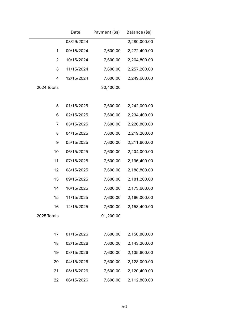 A-2 Date Payment ($s) Balance ($s) 08/29/2024 2,280,000.00 1 09/15/2024 7,600.00 2,272,400.00 2 10/15/2024 7,600.00 2,264,800.00 3 11/15/2024 7,600.00 2,257,200.00 4 12/15/2024 7,600.00 2,249,600.00 2024 Totals 30,400.00 5 01/15/2025 7,600.00 2,242,000.00 6 02/15/2025 7,600.00 2,234,400.00 7 03/15/2025 7,600.00 2,226,800.00 8 04/15/2025 7,600.00 2,219,200.00 9 05/15/2025 7,600.00 2,211,600.00 10 06/15/2025 7,600.00 2,204,000.00 11 07/15/2025 7,600.00 2,196,400.00 12 08/15/2025 7,600.00 2,188,800.00 13 09/15/2025 7,600.00 2,181,200.00 14 10/15/2025 7,600.00 2,173,600.00 15 11/15/2025 7,600.00 2,166,000.00 16 12/15/2025 7,600.00 2,158,400.00 2025 Totals 91,200.00 17 01/15/2026 7,600.00 2,150,800.00 18 02/15/2026 7,600.00 2,143,200.00 19 03/15/2026 7,600.00 2,135,600.00 20 04/15/2026 7,600.00 2,128,000.00 21 05/15/2026 7,600.00 2,120,400.00 22 06/15/2026 7,600.00 2,112,800.00