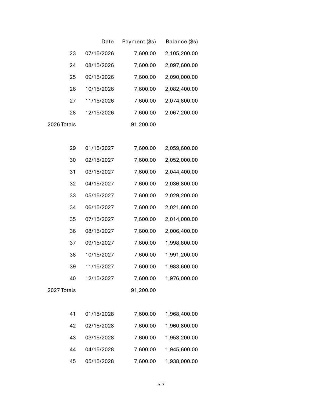 A-3 Date Payment ($s) Balance ($s) 23 07/15/2026 7,600.00 2,105,200.00 24 08/15/2026 7,600.00 2,097,600.00 25 09/15/2026 7,600.00 2,090,000.00 26 10/15/2026 7,600.00 2,082,400.00 27 11/15/2026 7,600.00 2,074,800.00 28 12/15/2026 7,600.00 2,067,200.00 2026 Totals 91,200.00 29 01/15/2027 7,600.00 2,059,600.00 30 02/15/2027 7,600.00 2,052,000.00 31 03/15/2027 7,600.00 2,044,400.00 32 04/15/2027 7,600.00 2,036,800.00 33 05/15/2027 7,600.00 2,029,200.00 34 06/15/2027 7,600.00 2,021,600.00 35 07/15/2027 7,600.00 2,014,000.00 36 08/15/2027 7,600.00 2,006,400.00 37 09/15/2027 7,600.00 1,998,800.00 38 10/15/2027 7,600.00 1,991,200.00 39 11/15/2027 7,600.00 1,983,600.00 40 12/15/2027 7,600.00 1,976,000.00 2027 Totals 91,200.00 41 01/15/2028 7,600.00 1,968,400.00 42 02/15/2028 7,600.00 1,960,800.00 43 03/15/2028 7,600.00 1,953,200.00 44 04/15/2028 7,600.00 1,945,600.00 45 05/15/2028 7,600.00 1,938,000.00