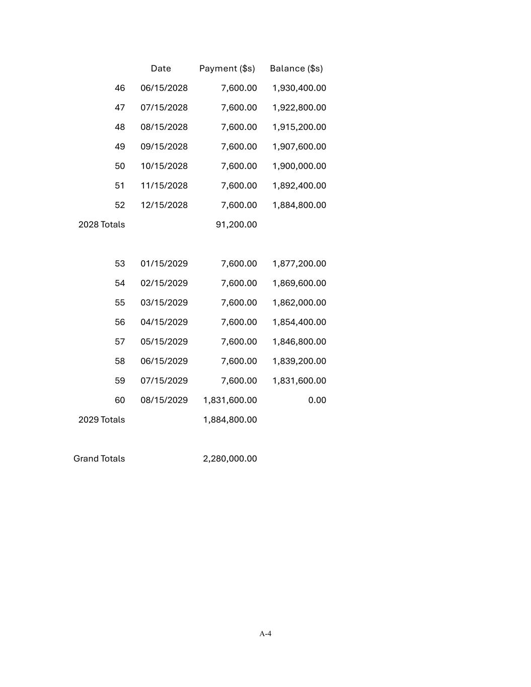 A-4 Date Payment ($s) Balance ($s) 46 06/15/2028 7,600.00 1,930,400.00 47 07/15/2028 7,600.00 1,922,800.00 48 08/15/2028 7,600.00 1,915,200.00 49 09/15/2028 7,600.00 1,907,600.00 50 10/15/2028 7,600.00 1,900,000.00 51 11/15/2028 7,600.00 1,892,400.00 52 12/15/2028 7,600.00 1,884,800.00 2028 Totals 91,200.00 53 01/15/2029 7,600.00 1,877,200.00 54 02/15/2029 7,600.00 1,869,600.00 55 03/15/2029 7,600.00 1,862,000.00 56 04/15/2029 7,600.00 1,854,400.00 57 05/15/2029 7,600.00 1,846,800.00 58 06/15/2029 7,600.00 1,839,200.00 59 07/15/2029 7,600.00 1,831,600.00 60 08/15/2029 1,831,600.00 0.00 2029 Totals 1,884,800.00 Grand Totals 2,280,000.00