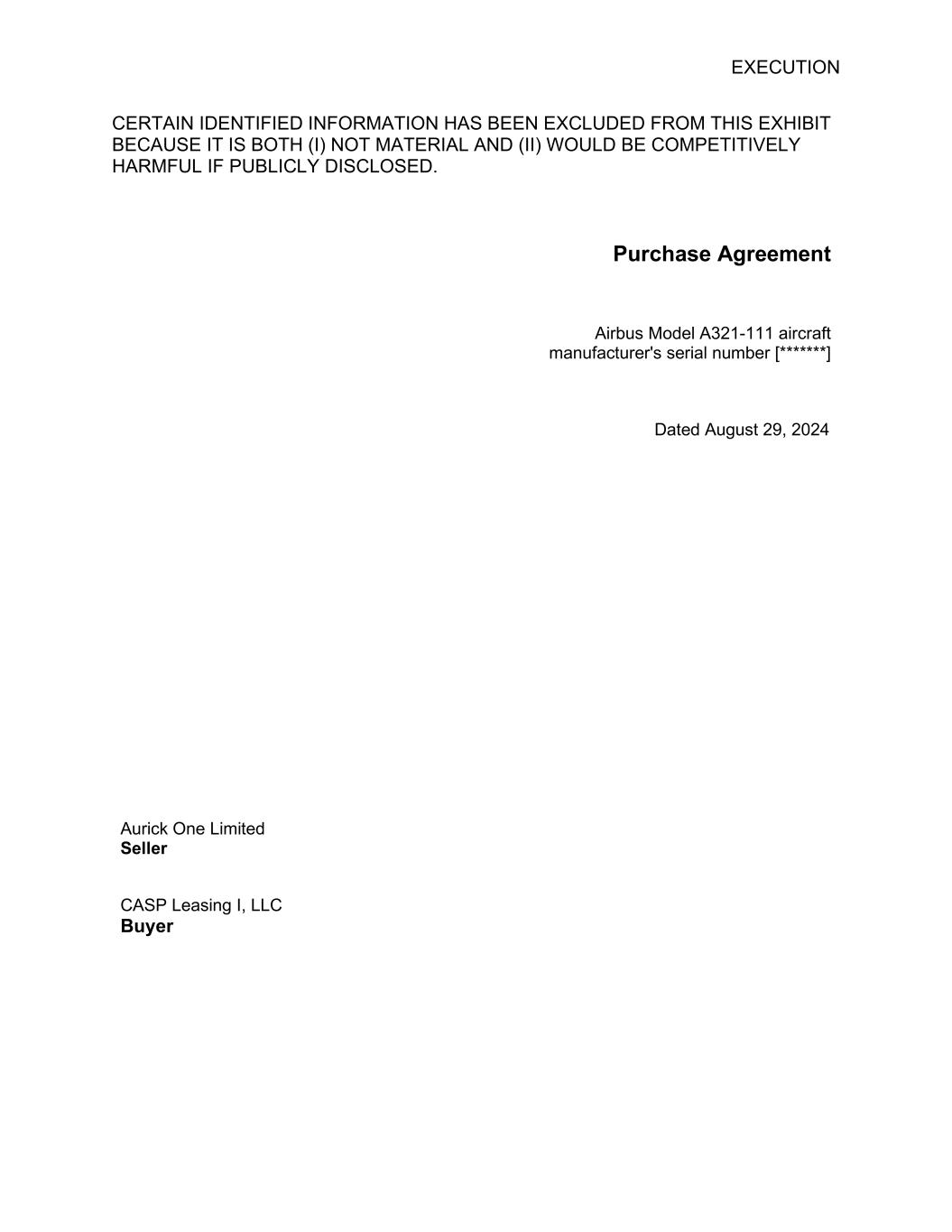 EXECUTION CERTAIN IDENTIFIED INFORMATION HAS BEEN EXCLUDED FROM THIS EXHIBIT BECAUSE IT IS BOTH (I) NOT MATERIAL AND (II) WOULD BE COMPETITIVELY HARMFUL IF PUBLICLY DISCLOSED. Purchase Agreement Airbus Model A321-111 aircraft manufacturer's serial number [*******] Dated August 29, 2024 Aurick One Limited Seller CASP Leasing I, LLC Buyer