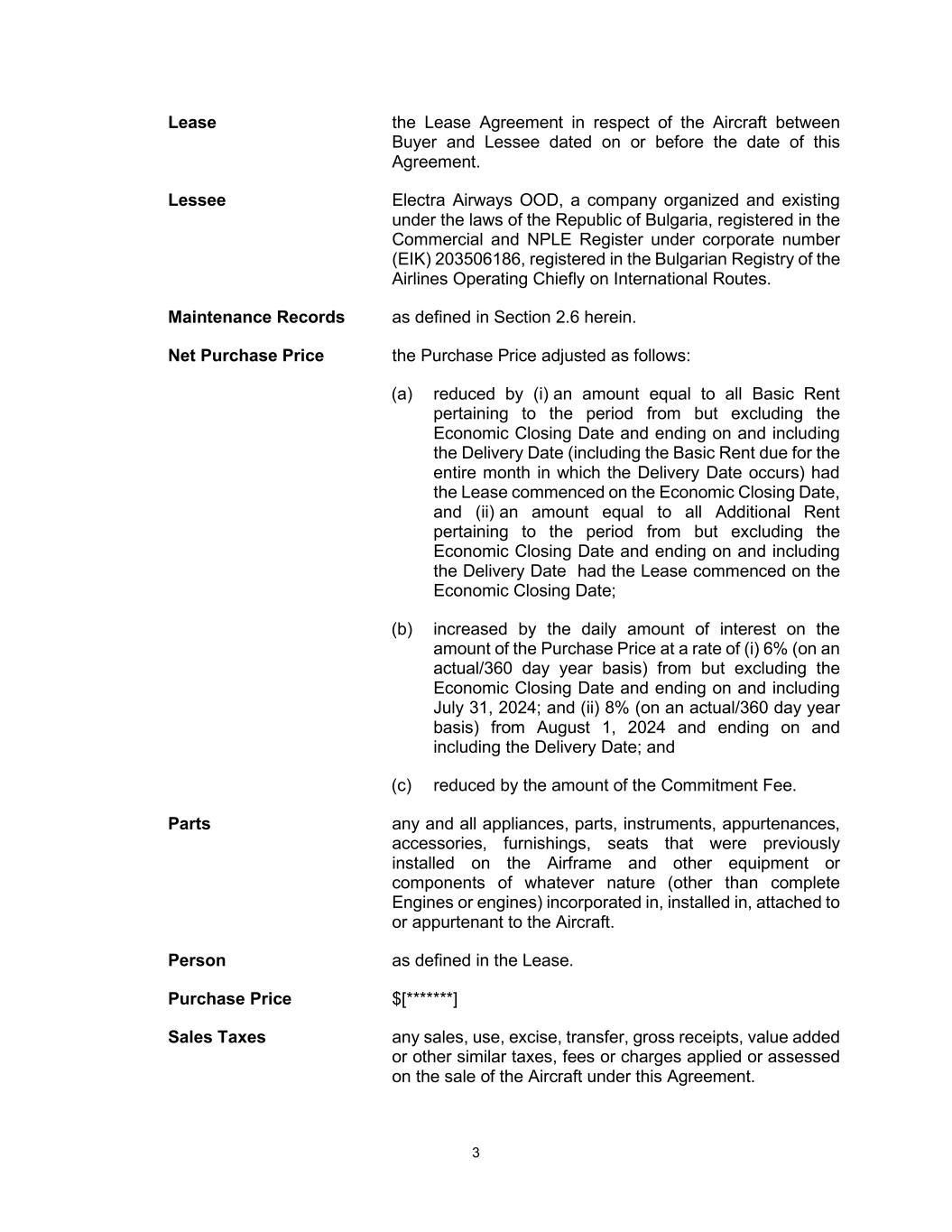3 Lease the Lease Agreement in respect of the Aircraft between Buyer and Lessee dated on or before the date of this Agreement. Lessee Electra Airways OOD, a company organized and existing under the laws of the Republic of Bulgaria, registered in the Commercial and NPLE Register under corporate number (EIK) 203506186, registered in the Bulgarian Registry of the Airlines Operating Chiefly on International Routes. Maintenance Records as defined in Section 2.6 herein. Net Purchase Price the Purchase Price adjusted as follows: (a) reduced by (i) an amount equal to all Basic Rent pertaining to the period from but excluding the Economic Closing Date and ending on and including the Delivery Date (including the Basic Rent due for the entire month in which the Delivery Date occurs) had the Lease commenced on the Economic Closing Date, and (ii) an amount equal to all Additional Rent pertaining to the period from but excluding the Economic Closing Date and ending on and including the Delivery Date had the Lease commenced on the Economic Closing Date; (b) increased by the daily amount of interest on the amount of the Purchase Price at a rate of (i) 6% (on an actual/360 day year basis) from but excluding the Economic Closing Date and ending on and including July 31, 2024; and (ii) 8% (on an actual/360 day year basis) from August 1, 2024 and ending on and including the Delivery Date; and (c) reduced by the amount of the Commitment Fee. Parts any and all appliances, parts, instruments, appurtenances, accessories, furnishings, seats that were previously installed on the Airframe and other equipment or components of whatever nature (other than complete Engines or engines) incorporated in, installed in, attached to or appurtenant to the Aircraft. Person as defined in the Lease. Purchase Price $[*******] Sales Taxes any sales, use, excise, transfer, gross receipts, value added or other similar taxes, fees or charges applied or assessed on the sale of the Aircraft under this Agreement.