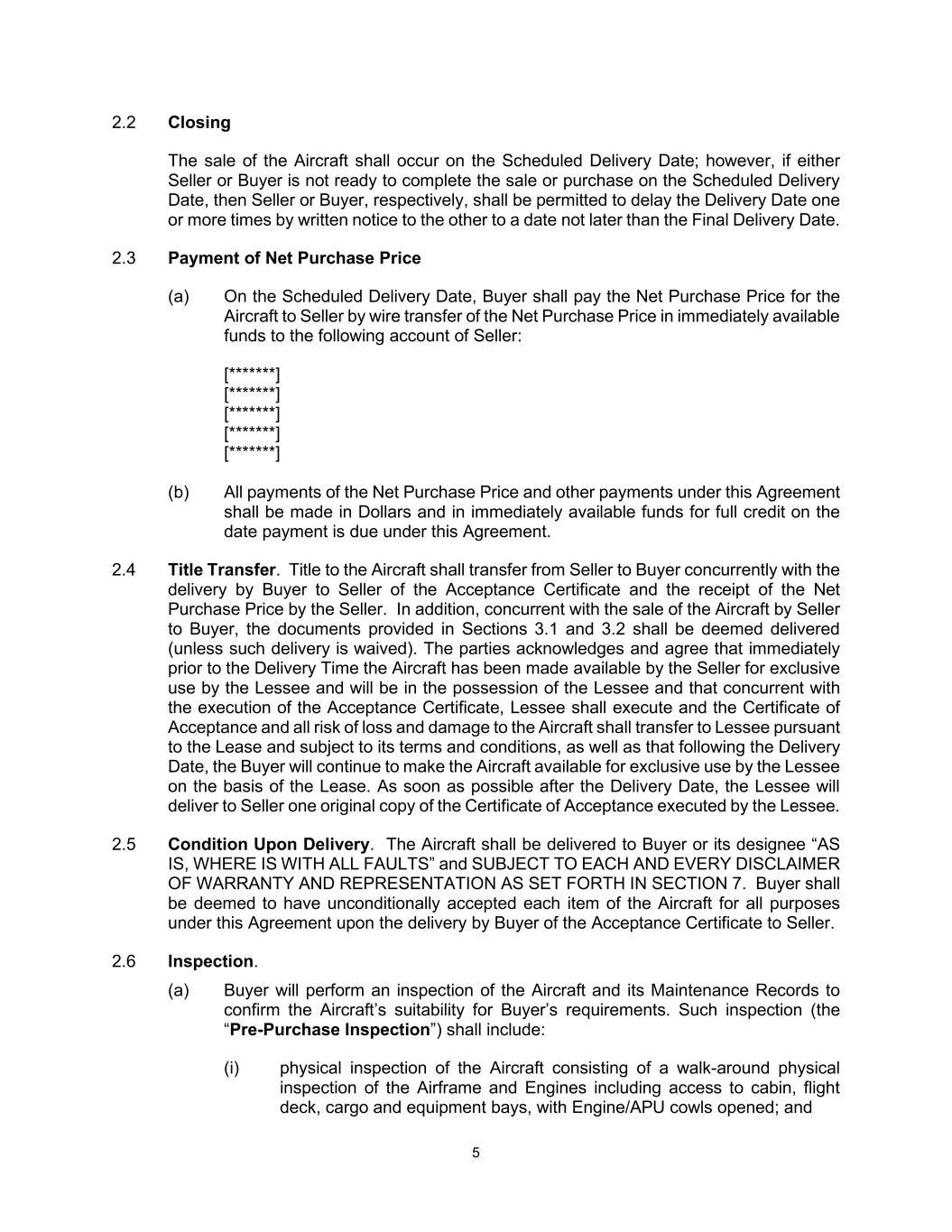 5 2.2 Closing The sale of the Aircraft shall occur on the Scheduled Delivery Date; however, if either Seller or Buyer is not ready to complete the sale or purchase on the Scheduled Delivery Date, then Seller or Buyer, respectively, shall be permitted to delay the Delivery Date one or more times by written notice to the other to a date not later than the Final Delivery Date. 2.3 Payment of Net Purchase Price (a) On the Scheduled Delivery Date, Buyer shall pay the Net Purchase Price for the Aircraft to Seller by wire transfer of the Net Purchase Price in immediately available funds to the following account of Seller: [*******] [*******] [*******] [*******] [*******] (b) All payments of the Net Purchase Price and other payments under this Agreement shall be made in Dollars and in immediately available funds for full credit on the date payment is due under this Agreement. 2.4 Title Transfer. Title to the Aircraft shall transfer from Seller to Buyer concurrently with the delivery by Buyer to Seller of the Acceptance Certificate and the receipt of the Net Purchase Price by the Seller. In addition, concurrent with the sale of the Aircraft by Seller to Buyer, the documents provided in Sections 3.1 and 3.2 shall be deemed delivered (unless such delivery is waived). The parties acknowledges and agree that immediately prior to the Delivery Time the Aircraft has been made available by the Seller for exclusive use by the Lessee and will be in the possession of the Lessee and that concurrent with the execution of the Acceptance Certificate, Lessee shall execute and the Certificate of Acceptance and all risk of loss and damage to the Aircraft shall transfer to Lessee pursuant to the Lease and subject to its terms and conditions, as well as that following the Delivery Date, the Buyer will continue to make the Aircraft available for exclusive use by the Lessee on the basis of the Lease. As soon as possible after the Delivery Date, the Lessee will deliver to Seller one original copy of the Certificate of Acceptance executed by the Lessee. 2.5 Condition Upon Delivery. The Aircraft shall be delivered to Buyer or its designee “AS IS, WHERE IS WITH ALL FAULTS” and SUBJECT TO EACH AND EVERY DISCLAIMER OF WARRANTY AND REPRESENTATION AS SET FORTH IN SECTION 7. Buyer shall be deemed to have unconditionally accepted each item of the Aircraft for all purposes under this Agreement upon the delivery by Buyer of the Acceptance Certificate to Seller. 2.6 Inspection. (a) Buyer will perform an inspection of the Aircraft and its Maintenance Records to confirm the Aircraft’s suitability for Buyer’s requirements. Such inspection (the “Pre-Purchase Inspection”) shall include: (i) physical inspection of the Aircraft consisting of a walk-around physical inspection of the Airframe and Engines including access to cabin, flight deck, cargo and equipment bays, with Engine/APU cowls opened; and