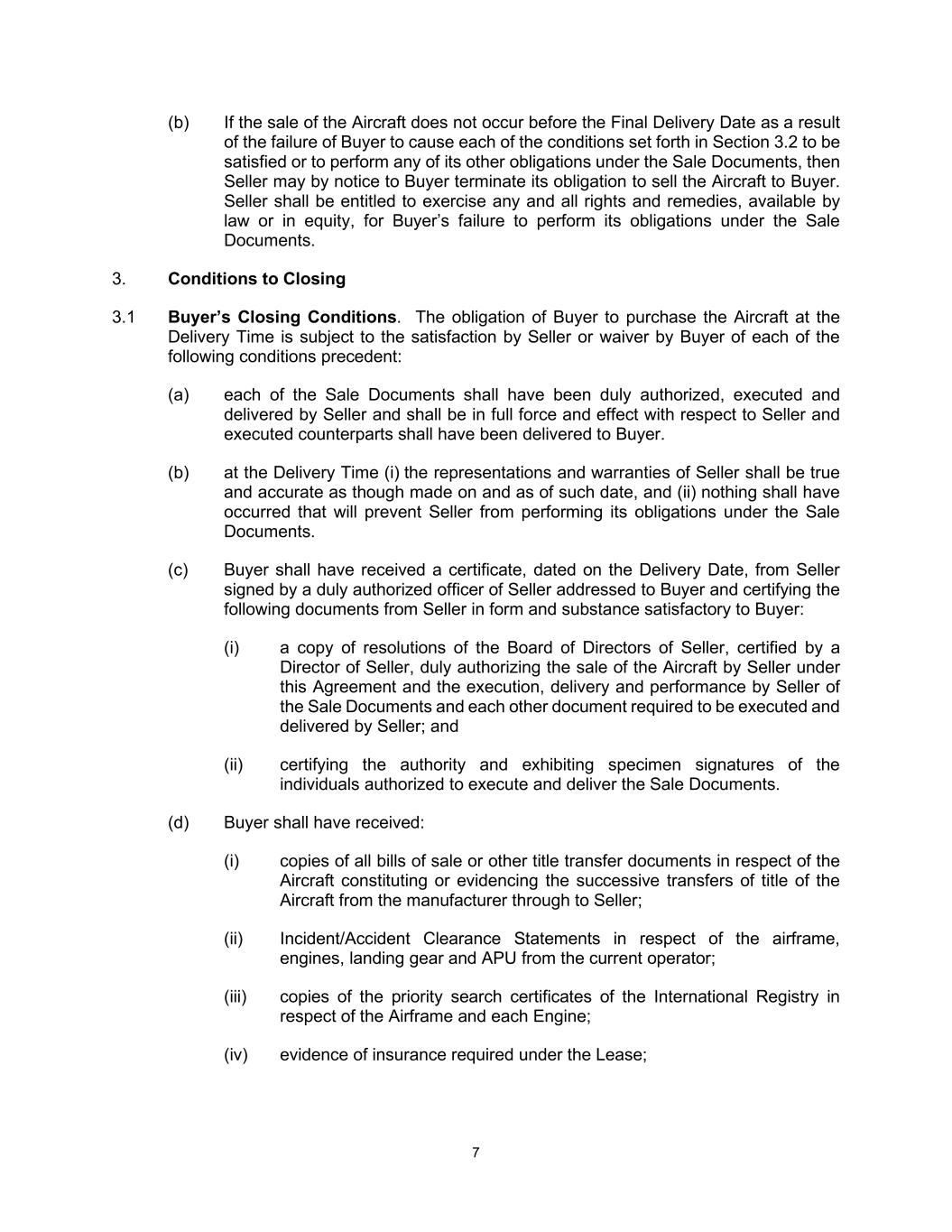 7 (b) If the sale of the Aircraft does not occur before the Final Delivery Date as a result of the failure of Buyer to cause each of the conditions set forth in Section 3.2 to be satisfied or to perform any of its other obligations under the Sale Documents, then Seller may by notice to Buyer terminate its obligation to sell the Aircraft to Buyer. Seller shall be entitled to exercise any and all rights and remedies, available by law or in equity, for Buyer’s failure to perform its obligations under the Sale Documents. 3. Conditions to Closing 3.1 Buyer’s Closing Conditions. The obligation of Buyer to purchase the Aircraft at the Delivery Time is subject to the satisfaction by Seller or waiver by Buyer of each of the following conditions precedent: (a) each of the Sale Documents shall have been duly authorized, executed and delivered by Seller and shall be in full force and effect with respect to Seller and executed counterparts shall have been delivered to Buyer. (b) at the Delivery Time (i) the representations and warranties of Seller shall be true and accurate as though made on and as of such date, and (ii) nothing shall have occurred that will prevent Seller from performing its obligations under the Sale Documents. (c) Buyer shall have received a certificate, dated on the Delivery Date, from Seller signed by a duly authorized officer of Seller addressed to Buyer and certifying the following documents from Seller in form and substance satisfactory to Buyer: (i) a copy of resolutions of the Board of Directors of Seller, certified by a Director of Seller, duly authorizing the sale of the Aircraft by Seller under this Agreement and the execution, delivery and performance by Seller of the Sale Documents and each other document required to be executed and delivered by Seller; and (ii) certifying the authority and exhibiting specimen signatures of the individuals authorized to execute and deliver the Sale Documents. (d) Buyer shall have received: (i) copies of all bills of sale or other title transfer documents in respect of the Aircraft constituting or evidencing the successive transfers of title of the Aircraft from the manufacturer through to Seller; (ii) Incident/Accident Clearance Statements in respect of the airframe, engines, landing gear and APU from the current operator; (iii) copies of the priority search certificates of the International Registry in respect of the Airframe and each Engine; (iv) evidence of insurance required under the Lease;