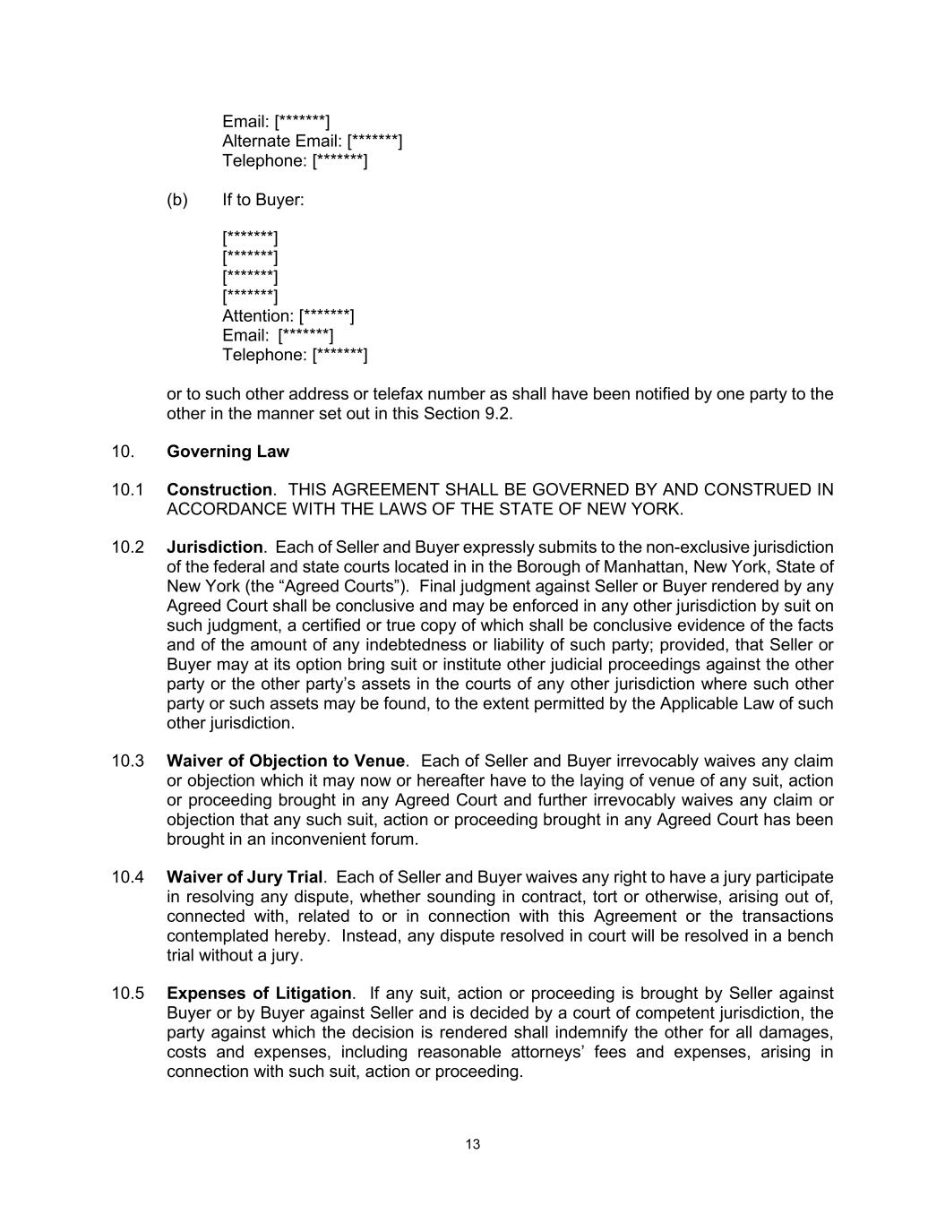 13 Email: [*******] Alternate Email: [*******] Telephone: [*******] (b) If to Buyer: [*******] [*******] [*******] [*******] Attention: [*******] Email: [*******] Telephone: [*******] or to such other address or telefax number as shall have been notified by one party to the other in the manner set out in this Section 9.2. 10. Governing Law 10.1 Construction. THIS AGREEMENT SHALL BE GOVERNED BY AND CONSTRUED IN ACCORDANCE WITH THE LAWS OF THE STATE OF NEW YORK. 10.2 Jurisdiction. Each of Seller and Buyer expressly submits to the non-exclusive jurisdiction of the federal and state courts located in in the Borough of Manhattan, New York, State of New York (the “Agreed Courts”). Final judgment against Seller or Buyer rendered by any Agreed Court shall be conclusive and may be enforced in any other jurisdiction by suit on such judgment, a certified or true copy of which shall be conclusive evidence of the facts and of the amount of any indebtedness or liability of such party; provided, that Seller or Buyer may at its option bring suit or institute other judicial proceedings against the other party or the other party’s assets in the courts of any other jurisdiction where such other party or such assets may be found, to the extent permitted by the Applicable Law of such other jurisdiction. 10.3 Waiver of Objection to Venue. Each of Seller and Buyer irrevocably waives any claim or objection which it may now or hereafter have to the laying of venue of any suit, action or proceeding brought in any Agreed Court and further irrevocably waives any claim or objection that any such suit, action or proceeding brought in any Agreed Court has been brought in an inconvenient forum. 10.4 Waiver of Jury Trial. Each of Seller and Buyer waives any right to have a jury participate in resolving any dispute, whether sounding in contract, tort or otherwise, arising out of, connected with, related to or in connection with this Agreement or the transactions contemplated hereby. Instead, any dispute resolved in court will be resolved in a bench trial without a jury. 10.5 Expenses of Litigation. If any suit, action or proceeding is brought by Seller against Buyer or by Buyer against Seller and is decided by a court of competent jurisdiction, the party against which the decision is rendered shall indemnify the other for all damages, costs and expenses, including reasonable attorneys’ fees and expenses, arising in connection with such suit, action or proceeding.