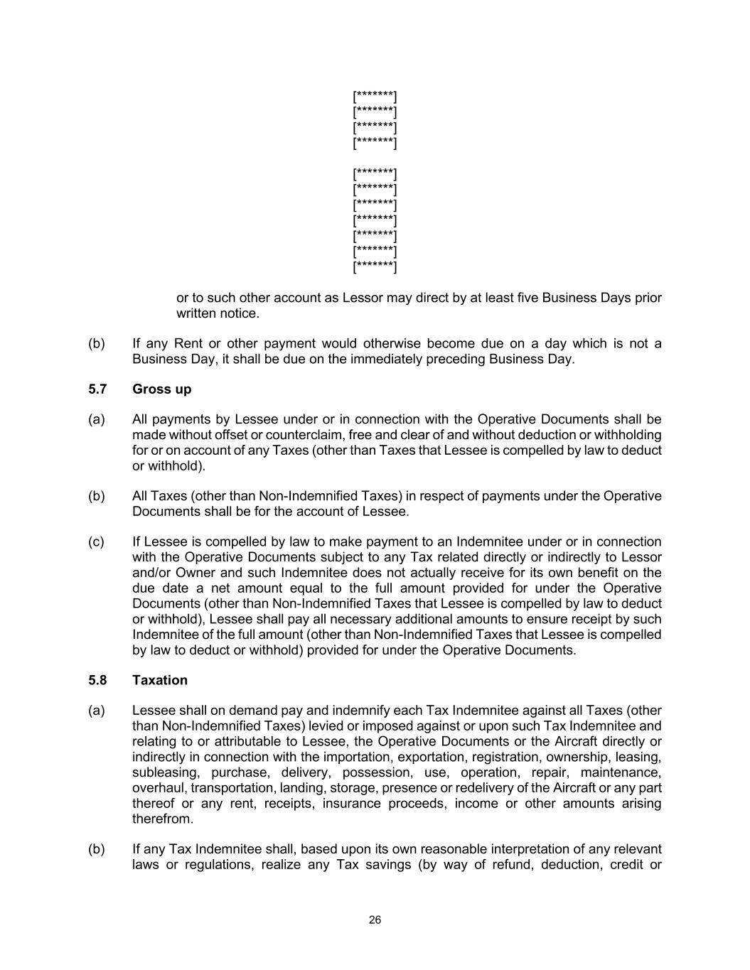 26 [*******] [*******] [*******] [*******] [*******] [*******] [*******] [*******] [*******] [*******] [*******] or to such other account as Lessor may direct by at least five Business Days prior written notice. (b) If any Rent or other payment would otherwise become due on a day which is not a Business Day, it shall be due on the immediately preceding Business Day. 5.7 Gross up (a) All payments by Lessee under or in connection with the Operative Documents shall be made without offset or counterclaim, free and clear of and without deduction or withholding for or on account of any Taxes (other than Taxes that Lessee is compelled by law to deduct or withhold). (b) All Taxes (other than Non-Indemnified Taxes) in respect of payments under the Operative Documents shall be for the account of Lessee. (c) If Lessee is compelled by law to make payment to an Indemnitee under or in connection with the Operative Documents subject to any Tax related directly or indirectly to Lessor and/or Owner and such Indemnitee does not actually receive for its own benefit on the due date a net amount equal to the full amount provided for under the Operative Documents (other than Non-Indemnified Taxes that Lessee is compelled by law to deduct or withhold), Lessee shall pay all necessary additional amounts to ensure receipt by such Indemnitee of the full amount (other than Non-Indemnified Taxes that Lessee is compelled by law to deduct or withhold) provided for under the Operative Documents. 5.8 Taxation (a) Lessee shall on demand pay and indemnify each Tax Indemnitee against all Taxes (other than Non-Indemnified Taxes) levied or imposed against or upon such Tax Indemnitee and relating to or attributable to Lessee, the Operative Documents or the Aircraft directly or indirectly in connection with the importation, exportation, registration, ownership, leasing, subleasing, purchase, delivery, possession, use, operation, repair, maintenance, overhaul, transportation, landing, storage, presence or redelivery of the Aircraft or any part thereof or any rent, receipts, insurance proceeds, income or other amounts arising therefrom. (b) If any Tax Indemnitee shall, based upon its own reasonable interpretation of any relevant laws or regulations, realize any Tax savings (by way of refund, deduction, credit or