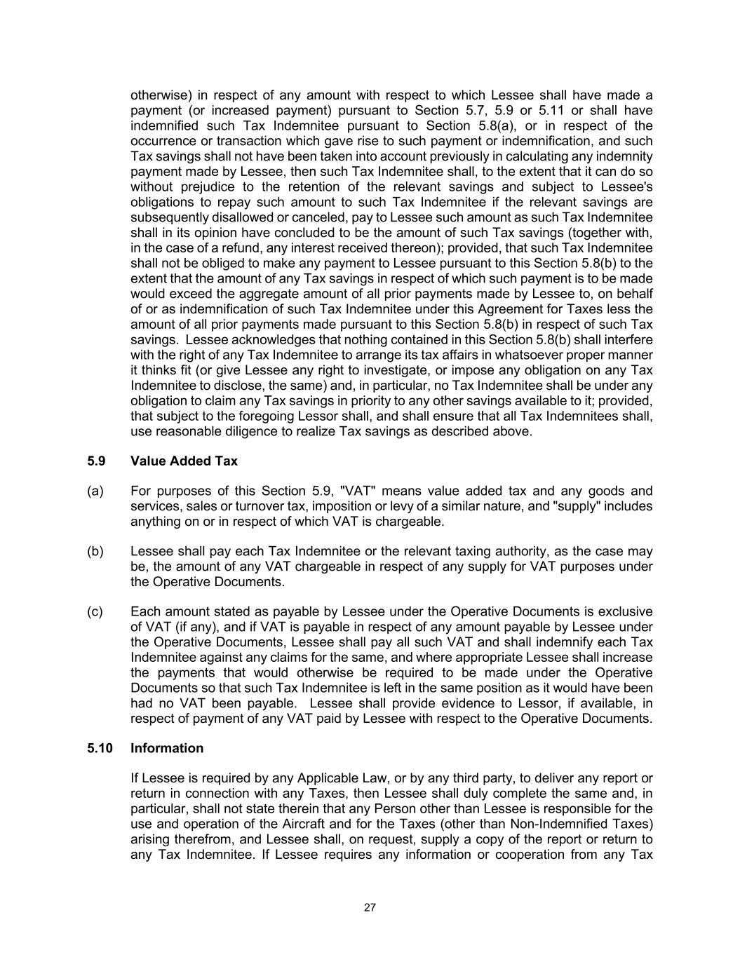 27 otherwise) in respect of any amount with respect to which Lessee shall have made a payment (or increased payment) pursuant to Section 5.7, 5.9 or 5.11 or shall have indemnified such Tax Indemnitee pursuant to Section 5.8(a), or in respect of the occurrence or transaction which gave rise to such payment or indemnification, and such Tax savings shall not have been taken into account previously in calculating any indemnity payment made by Lessee, then such Tax Indemnitee shall, to the extent that it can do so without prejudice to the retention of the relevant savings and subject to Lessee's obligations to repay such amount to such Tax Indemnitee if the relevant savings are subsequently disallowed or canceled, pay to Lessee such amount as such Tax Indemnitee shall in its opinion have concluded to be the amount of such Tax savings (together with, in the case of a refund, any interest received thereon); provided, that such Tax Indemnitee shall not be obliged to make any payment to Lessee pursuant to this Section 5.8(b) to the extent that the amount of any Tax savings in respect of which such payment is to be made would exceed the aggregate amount of all prior payments made by Lessee to, on behalf of or as indemnification of such Tax Indemnitee under this Agreement for Taxes less the amount of all prior payments made pursuant to this Section 5.8(b) in respect of such Tax savings. Lessee acknowledges that nothing contained in this Section 5.8(b) shall interfere with the right of any Tax Indemnitee to arrange its tax affairs in whatsoever proper manner it thinks fit (or give Lessee any right to investigate, or impose any obligation on any Tax Indemnitee to disclose, the same) and, in particular, no Tax Indemnitee shall be under any obligation to claim any Tax savings in priority to any other savings available to it; provided, that subject to the foregoing Lessor shall, and shall ensure that all Tax Indemnitees shall, use reasonable diligence to realize Tax savings as described above. 5.9 Value Added Tax (a) For purposes of this Section 5.9, "VAT" means value added tax and any goods and services, sales or turnover tax, imposition or levy of a similar nature, and "supply" includes anything on or in respect of which VAT is chargeable. (b) Lessee shall pay each Tax Indemnitee or the relevant taxing authority, as the case may be, the amount of any VAT chargeable in respect of any supply for VAT purposes under the Operative Documents. (c) Each amount stated as payable by Lessee under the Operative Documents is exclusive of VAT (if any), and if VAT is payable in respect of any amount payable by Lessee under the Operative Documents, Lessee shall pay all such VAT and shall indemnify each Tax Indemnitee against any claims for the same, and where appropriate Lessee shall increase the payments that would otherwise be required to be made under the Operative Documents so that such Tax Indemnitee is left in the same position as it would have been had no VAT been payable. Lessee shall provide evidence to Lessor, if available, in respect of payment of any VAT paid by Lessee with respect to the Operative Documents. 5.10 Information If Lessee is required by any Applicable Law, or by any third party, to deliver any report or return in connection with any Taxes, then Lessee shall duly complete the same and, in particular, shall not state therein that any Person other than Lessee is responsible for the use and operation of the Aircraft and for the Taxes (other than Non-Indemnified Taxes) arising therefrom, and Lessee shall, on request, supply a copy of the report or return to any Tax Indemnitee. If Lessee requires any information or cooperation from any Tax
