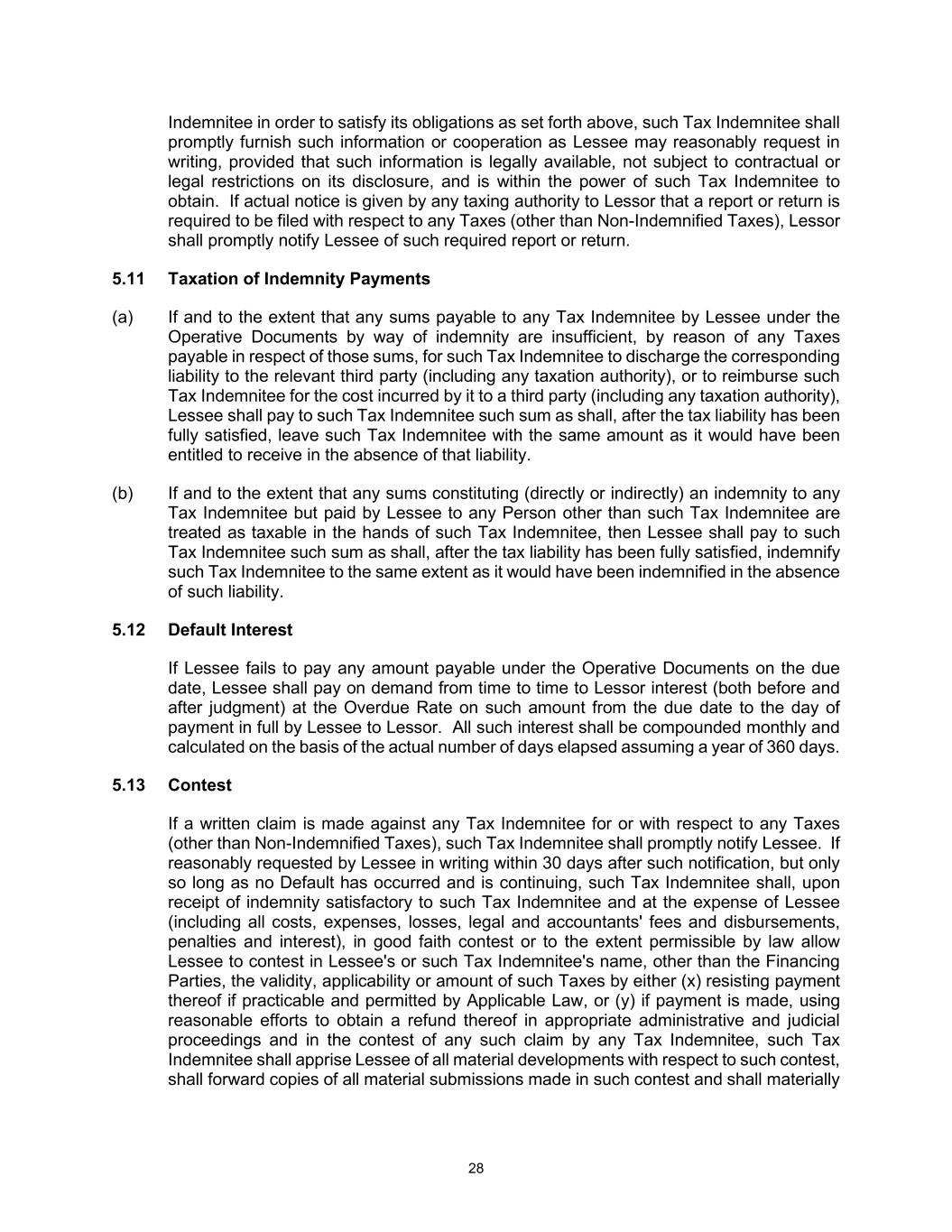 28 Indemnitee in order to satisfy its obligations as set forth above, such Tax Indemnitee shall promptly furnish such information or cooperation as Lessee may reasonably request in writing, provided that such information is legally available, not subject to contractual or legal restrictions on its disclosure, and is within the power of such Tax Indemnitee to obtain. If actual notice is given by any taxing authority to Lessor that a report or return is required to be filed with respect to any Taxes (other than Non-Indemnified Taxes), Lessor shall promptly notify Lessee of such required report or return. 5.11 Taxation of Indemnity Payments (a) If and to the extent that any sums payable to any Tax Indemnitee by Lessee under the Operative Documents by way of indemnity are insufficient, by reason of any Taxes payable in respect of those sums, for such Tax Indemnitee to discharge the corresponding liability to the relevant third party (including any taxation authority), or to reimburse such Tax Indemnitee for the cost incurred by it to a third party (including any taxation authority), Lessee shall pay to such Tax Indemnitee such sum as shall, after the tax liability has been fully satisfied, leave such Tax Indemnitee with the same amount as it would have been entitled to receive in the absence of that liability. (b) If and to the extent that any sums constituting (directly or indirectly) an indemnity to any Tax Indemnitee but paid by Lessee to any Person other than such Tax Indemnitee are treated as taxable in the hands of such Tax Indemnitee, then Lessee shall pay to such Tax Indemnitee such sum as shall, after the tax liability has been fully satisfied, indemnify such Tax Indemnitee to the same extent as it would have been indemnified in the absence of such liability. 5.12 Default Interest If Lessee fails to pay any amount payable under the Operative Documents on the due date, Lessee shall pay on demand from time to time to Lessor interest (both before and after judgment) at the Overdue Rate on such amount from the due date to the day of payment in full by Lessee to Lessor. All such interest shall be compounded monthly and calculated on the basis of the actual number of days elapsed assuming a year of 360 days. 5.13 Contest If a written claim is made against any Tax Indemnitee for or with respect to any Taxes (other than Non-Indemnified Taxes), such Tax Indemnitee shall promptly notify Lessee. If reasonably requested by Lessee in writing within 30 days after such notification, but only so long as no Default has occurred and is continuing, such Tax Indemnitee shall, upon receipt of indemnity satisfactory to such Tax Indemnitee and at the expense of Lessee (including all costs, expenses, losses, legal and accountants' fees and disbursements, penalties and interest), in good faith contest or to the extent permissible by law allow Lessee to contest in Lessee's or such Tax Indemnitee's name, other than the Financing Parties, the validity, applicability or amount of such Taxes by either (x) resisting payment thereof if practicable and permitted by Applicable Law, or (y) if payment is made, using reasonable efforts to obtain a refund thereof in appropriate administrative and judicial proceedings and in the contest of any such claim by any Tax Indemnitee, such Tax Indemnitee shall apprise Lessee of all material developments with respect to such contest, shall forward copies of all material submissions made in such contest and shall materially
