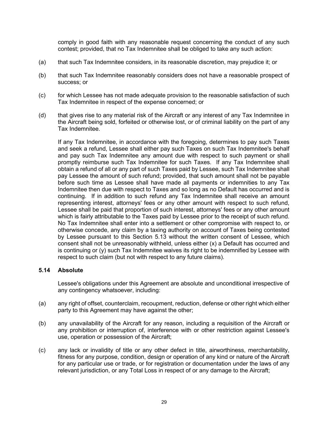 29 comply in good faith with any reasonable request concerning the conduct of any such contest; provided, that no Tax Indemnitee shall be obliged to take any such action: (a) that such Tax Indemnitee considers, in its reasonable discretion, may prejudice it; or (b) that such Tax Indemnitee reasonably considers does not have a reasonable prospect of success; or (c) for which Lessee has not made adequate provision to the reasonable satisfaction of such Tax Indemnitee in respect of the expense concerned; or (d) that gives rise to any material risk of the Aircraft or any interest of any Tax Indemnitee in the Aircraft being sold, forfeited or otherwise lost, or of criminal liability on the part of any Tax Indemnitee. If any Tax Indemnitee, in accordance with the foregoing, determines to pay such Taxes and seek a refund, Lessee shall either pay such Taxes on such Tax Indemnitee's behalf and pay such Tax Indemnitee any amount due with respect to such payment or shall promptly reimburse such Tax Indemnitee for such Taxes. If any Tax Indemnitee shall obtain a refund of all or any part of such Taxes paid by Lessee, such Tax Indemnitee shall pay Lessee the amount of such refund; provided, that such amount shall not be payable before such time as Lessee shall have made all payments or indemnities to any Tax Indemnitee then due with respect to Taxes and so long as no Default has occurred and is continuing. If in addition to such refund any Tax Indemnitee shall receive an amount representing interest, attorneys' fees or any other amount with respect to such refund, Lessee shall be paid that proportion of such interest, attorneys' fees or any other amount which is fairly attributable to the Taxes paid by Lessee prior to the receipt of such refund. No Tax Indemnitee shall enter into a settlement or other compromise with respect to, or otherwise concede, any claim by a taxing authority on account of Taxes being contested by Lessee pursuant to this Section 5.13 without the written consent of Lessee, which consent shall not be unreasonably withheld, unless either (x) a Default has occurred and is continuing or (y) such Tax Indemnitee waives its right to be indemnified by Lessee with respect to such claim (but not with respect to any future claims). 5.14 Absolute Lessee's obligations under this Agreement are absolute and unconditional irrespective of any contingency whatsoever, including: (a) any right of offset, counterclaim, recoupment, reduction, defense or other right which either party to this Agreement may have against the other; (b) any unavailability of the Aircraft for any reason, including a requisition of the Aircraft or any prohibition or interruption of, interference with or other restriction against Lessee's use, operation or possession of the Aircraft; (c) any lack or invalidity of title or any other defect in title, airworthiness, merchantability, fitness for any purpose, condition, design or operation of any kind or nature of the Aircraft for any particular use or trade, or for registration or documentation under the laws of any relevant jurisdiction, or any Total Loss in respect of or any damage to the Aircraft;