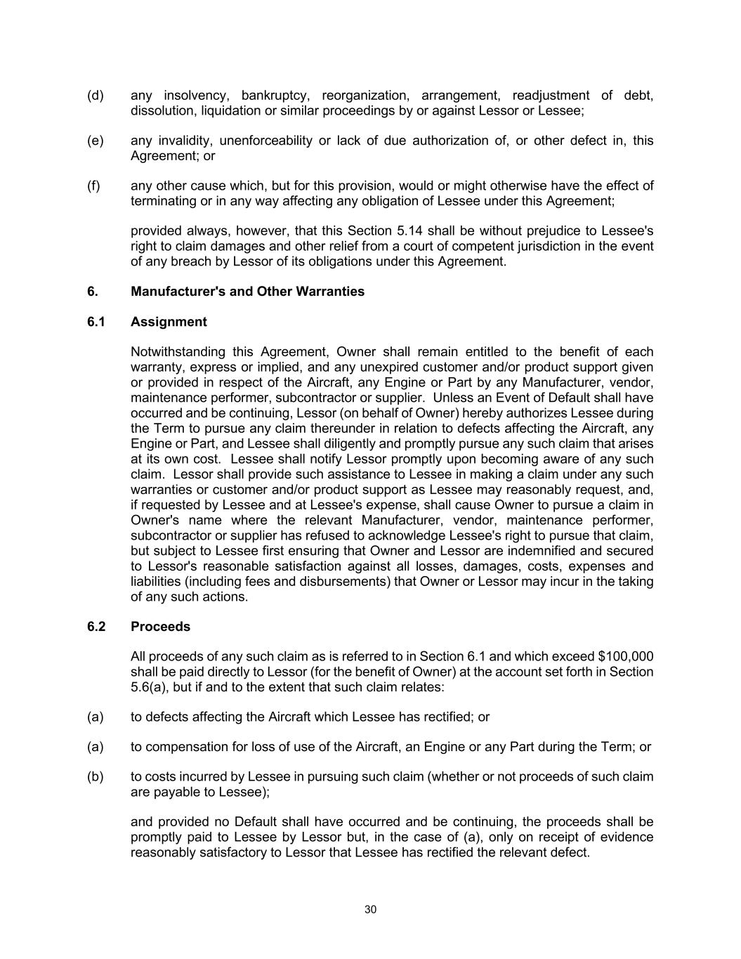 30 (d) any insolvency, bankruptcy, reorganization, arrangement, readjustment of debt, dissolution, liquidation or similar proceedings by or against Lessor or Lessee; (e) any invalidity, unenforceability or lack of due authorization of, or other defect in, this Agreement; or (f) any other cause which, but for this provision, would or might otherwise have the effect of terminating or in any way affecting any obligation of Lessee under this Agreement; provided always, however, that this Section 5.14 shall be without prejudice to Lessee's right to claim damages and other relief from a court of competent jurisdiction in the event of any breach by Lessor of its obligations under this Agreement. 6. Manufacturer's and Other Warranties 6.1 Assignment Notwithstanding this Agreement, Owner shall remain entitled to the benefit of each warranty, express or implied, and any unexpired customer and/or product support given or provided in respect of the Aircraft, any Engine or Part by any Manufacturer, vendor, maintenance performer, subcontractor or supplier. Unless an Event of Default shall have occurred and be continuing, Lessor (on behalf of Owner) hereby authorizes Lessee during the Term to pursue any claim thereunder in relation to defects affecting the Aircraft, any Engine or Part, and Lessee shall diligently and promptly pursue any such claim that arises at its own cost. Lessee shall notify Lessor promptly upon becoming aware of any such claim. Lessor shall provide such assistance to Lessee in making a claim under any such warranties or customer and/or product support as Lessee may reasonably request, and, if requested by Lessee and at Lessee's expense, shall cause Owner to pursue a claim in Owner's name where the relevant Manufacturer, vendor, maintenance performer, subcontractor or supplier has refused to acknowledge Lessee's right to pursue that claim, but subject to Lessee first ensuring that Owner and Lessor are indemnified and secured to Lessor's reasonable satisfaction against all losses, damages, costs, expenses and liabilities (including fees and disbursements) that Owner or Lessor may incur in the taking of any such actions. 6.2 Proceeds All proceeds of any such claim as is referred to in Section 6.1 and which exceed $100,000 shall be paid directly to Lessor (for the benefit of Owner) at the account set forth in Section 5.6(a), but if and to the extent that such claim relates: (a) to defects affecting the Aircraft which Lessee has rectified; or (a) to compensation for loss of use of the Aircraft, an Engine or any Part during the Term; or (b) to costs incurred by Lessee in pursuing such claim (whether or not proceeds of such claim are payable to Lessee); and provided no Default shall have occurred and be continuing, the proceeds shall be promptly paid to Lessee by Lessor but, in the case of (a), only on receipt of evidence reasonably satisfactory to Lessor that Lessee has rectified the relevant defect.