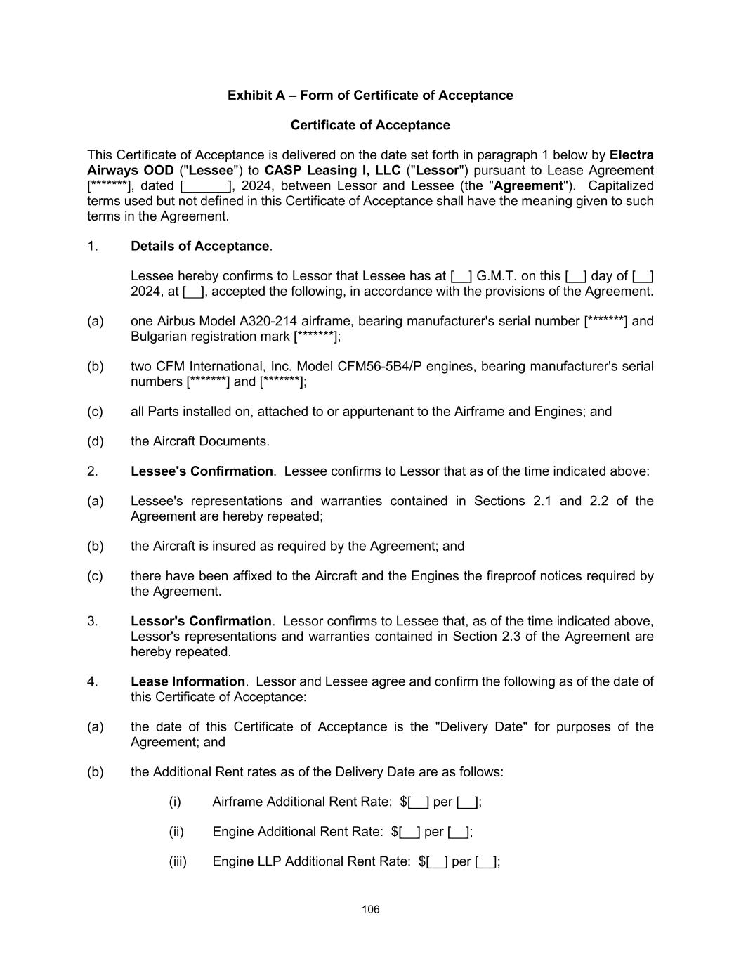 106 Exhibit A – Form of Certificate of Acceptance Certificate of Acceptance This Certificate of Acceptance is delivered on the date set forth in paragraph 1 below by Electra Airways OOD ("Lessee") to CASP Leasing I, LLC ("Lessor") pursuant to Lease Agreement [*******], dated [______], 2024, between Lessor and Lessee (the "Agreement"). Capitalized terms used but not defined in this Certificate of Acceptance shall have the meaning given to such terms in the Agreement. 1. Details of Acceptance. Lessee hereby confirms to Lessor that Lessee has at [__] G.M.T. on this [__] day of [__] 2024, at [__], accepted the following, in accordance with the provisions of the Agreement. (a) one Airbus Model A320-214 airframe, bearing manufacturer's serial number [*******] and Bulgarian registration mark [*******]; (b) two CFM International, Inc. Model CFM56-5B4/P engines, bearing manufacturer's serial numbers [*******] and [*******]; (c) all Parts installed on, attached to or appurtenant to the Airframe and Engines; and (d) the Aircraft Documents. 2. Lessee's Confirmation. Lessee confirms to Lessor that as of the time indicated above: (a) Lessee's representations and warranties contained in Sections 2.1 and 2.2 of the Agreement are hereby repeated; (b) the Aircraft is insured as required by the Agreement; and (c) there have been affixed to the Aircraft and the Engines the fireproof notices required by the Agreement. 3. Lessor's Confirmation. Lessor confirms to Lessee that, as of the time indicated above, Lessor's representations and warranties contained in Section 2.3 of the Agreement are hereby repeated. 4. Lease Information. Lessor and Lessee agree and confirm the following as of the date of this Certificate of Acceptance: (a) the date of this Certificate of Acceptance is the "Delivery Date" for purposes of the Agreement; and (b) the Additional Rent rates as of the Delivery Date are as follows: (i) Airframe Additional Rent Rate: $[__] per [__]; (ii) Engine Additional Rent Rate: $[__] per [__]; (iii) Engine LLP Additional Rent Rate: $[__] per [__];