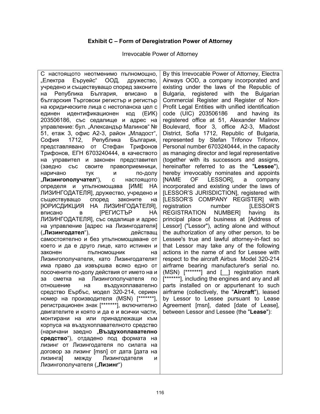 116 Exhibit C – Form of Deregistration Power of Attorney Irrevocable Power of Attorney С настоящото неотменимо пълномощно, „Електра Еъруейс“ ООД, дружество, учредено и съществуващо според законите на Република България, вписано в българския Търговски регистър и регистър на юридическите лица с нестопанска цел с единен идентификационен код (ЕИК) 203506186, със седалище и адрес на управление: бул. „Александър Малинов“ № 51, етаж 3, офис А2-3, район „Младост“, София 1712, Република България, представлявано от Стефан Трифонов Трифонов, ЕГН 6703240444, в качеството на управител и законен представител (заедно със своите правоприемници, наричано тук и по-долу „Лизингополучател“), с настоящото определя и упълномощава [ИМЕ НА ЛИЗИНГОДАТЕЛЯ], дружество, учредено и съществуващо според законите на [ЮРИСДИКЦИЯ НА ЛИЗИНГОДАТЕЛЯ], вписано в [РЕГИСТЪР НА ЛИЗИНГОДАТЕЛЯ], със седалище и адрес на управление [адрес на Лизингодателя] („Лизингодател“), действащ самостоятелно и без упълномощаване от което и да е друго лице, като истинен и законен пълномощник на Лизингополучателя, като Лизингодателят има право да извършва всяко едно от посочените по-долу действия от името на и за сметка на Лизингополучателя по отношение на въздухоплавателно средство Еърбъс, модел 320-214, сериен номер на производителя (MSN) [*******], регистрационен знак [*******], включително двигателите и която и да е и всички части, монтирани на или принадлежащи към корпуса на въздухоплавателното средство (наричани заедно „Въздухоплавателно средство“), отдадено под формата на лизинг от Лизингодателя по силата на договор за лизинг [msn] от дата [дата на лизинга] между Лизингодателя и Лизингополучателя („Лизинг“) By this Irrevocable Power of Attorney, Electra Airways OOD, a company incorporated and existing under the laws of the Republic of Bulgaria, registered with the Bulgarian Commercial Register and Register of Non- Profit Legal Entities with unified identification code (UIC) 203506186 and having its registered office at 51, Alexander Malinov Boulevard, floor 3, office A2-3, Mladost District, Sofia 1712, Republic of Bulgaria, represented by Stefan Trifonov Trifonov, Personal number 6703240444, in the capacity as managing director and legal representative (together with its successors and assigns, hereinafter referred to as the "Lessee"), hereby irrevocably nominates and appoints [NAME OF LESSOR], a company incorporated and existing under the laws of [LESSOR’S JURISDICTION], registered with [LESSOR’S COMPANY REGISTER] with registration number [LESSOR’S REGISTRATION NUMBER] having its principal place of business at [Address of Lessor] ("Lessor"), acting alone and without the authorization of any other person, to be Lessee's true and lawful attorney-in-fact so that Lessor may take any of the following actions in the name of and for Lessee with respect to the aircraft Airbus Model 320-214 airframe bearing manufacturer's serial no. (MSN) [*******] and [__] registration mark [*******], including the engines and any and all parts installed on or appurtenant to such airframe (collectively, the "Aircraft"), leased by Lessor to Lessee pursuant to Lease Agreement [msn], dated [date of Lease], between Lessor and Lessee (the "Lease"):