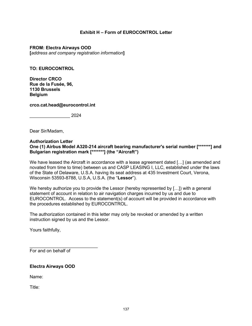 137 Exhibit H – Form of EUROCONTROL Letter FROM: Electra Airways OOD [address and company registration information] TO: EUROCONTROL Director CRCO Rue de la Fusée, 96, 1130 Brussels Belgium crco.cat.head@eurocontrol.int ________________ 2024 Dear Sir/Madam, Authorization Letter One (1) Airbus Model A320-214 aircraft bearing manufacturer's serial number [*******] and Bulgarian registration mark [*******] (the “Aircraft”) We have leased the Aircraft in accordance with a lease agreement dated […] (as amended and novated from time to time) between us and CASP LEASING I, LLC, established under the laws of the State of Delaware, U.S.A. having its seat address at 435 Investment Court, Verona, Wisconsin 53593-8788, U.S.A, U.S.A. (the “Lessor”). We hereby authorize you to provide the Lessor (hereby represented by […]) with a general statement of account in relation to air navigation charges incurred by us and due to EUROCONTROL. Access to the statement(s) of account will be provided in accordance with the procedures established by EUROCONTROL. The authorization contained in this letter may only be revoked or amended by a written instruction signed by us and the Lessor. Yours faithfully, ___________________________ For and on behalf of Electra Airways OOD Name: Title: