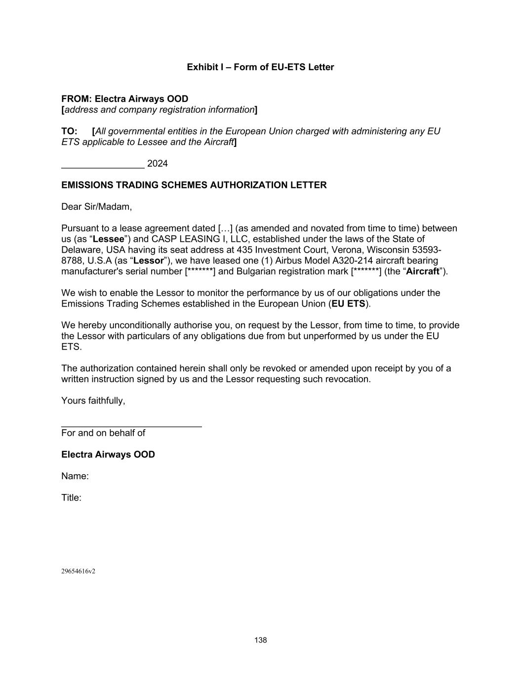 138 Exhibit I – Form of EU-ETS Letter FROM: Electra Airways OOD [address and company registration information] TO: [All governmental entities in the European Union charged with administering any EU ETS applicable to Lessee and the Aircraft] ________________ 2024 EMISSIONS TRADING SCHEMES AUTHORIZATION LETTER Dear Sir/Madam, Pursuant to a lease agreement dated […] (as amended and novated from time to time) between us (as “Lessee”) and CASP LEASING I, LLC, established under the laws of the State of Delaware, USA having its seat address at 435 Investment Court, Verona, Wisconsin 53593- 8788, U.S.A (as “Lessor”), we have leased one (1) Airbus Model A320-214 aircraft bearing manufacturer's serial number [*******] and Bulgarian registration mark [*******] (the “Aircraft”). We wish to enable the Lessor to monitor the performance by us of our obligations under the Emissions Trading Schemes established in the European Union (EU ETS). We hereby unconditionally authorise you, on request by the Lessor, from time to time, to provide the Lessor with particulars of any obligations due from but unperformed by us under the EU ETS. The authorization contained herein shall only be revoked or amended upon receipt by you of a written instruction signed by us and the Lessor requesting such revocation. Yours faithfully, ___________________________ For and on behalf of Electra Airways OOD Name: Title: 29654616v2