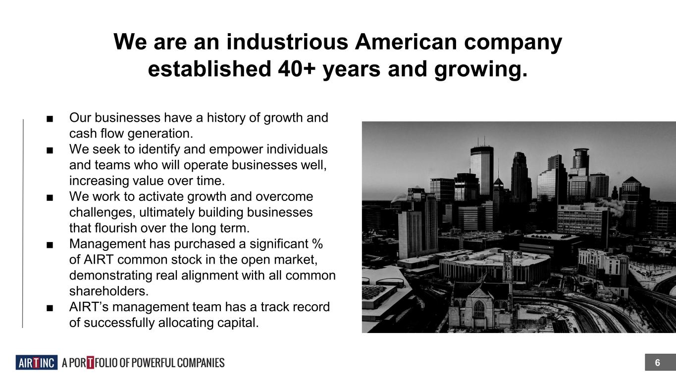 We are an industrious American company established 40+ years and growing. 6 ■ Our businesses have a history of growth and cash flow generation. ■ We seek to identify and empower individuals and teams who will operate businesses well, increasing value over time. ■ We work to activate growth and overcome challenges, ultimately building businesses that flourish over the long term. ■ Management has purchased a significant % of AIRT common stock in the open market, demonstrating real alignment with all common shareholders. ■ AIRT’s management team has a track record of successfully allocating capital.