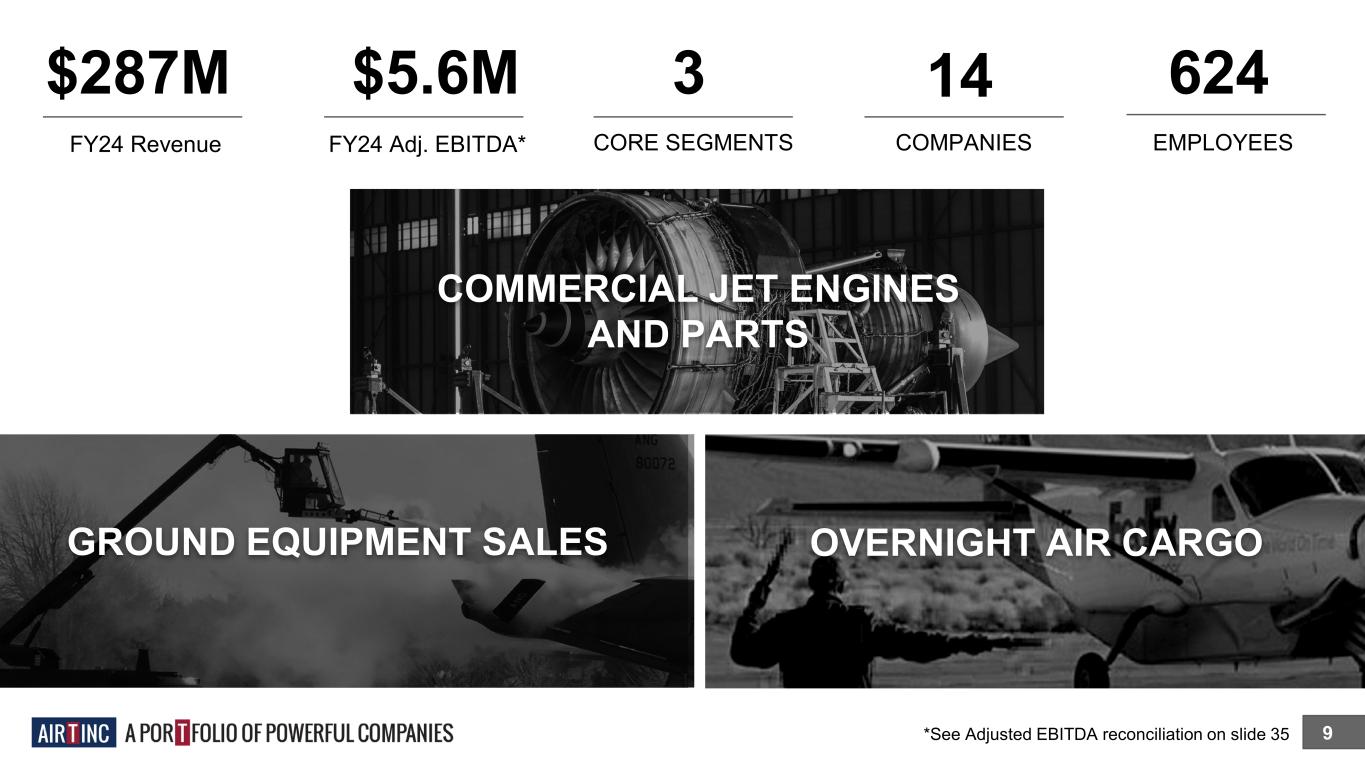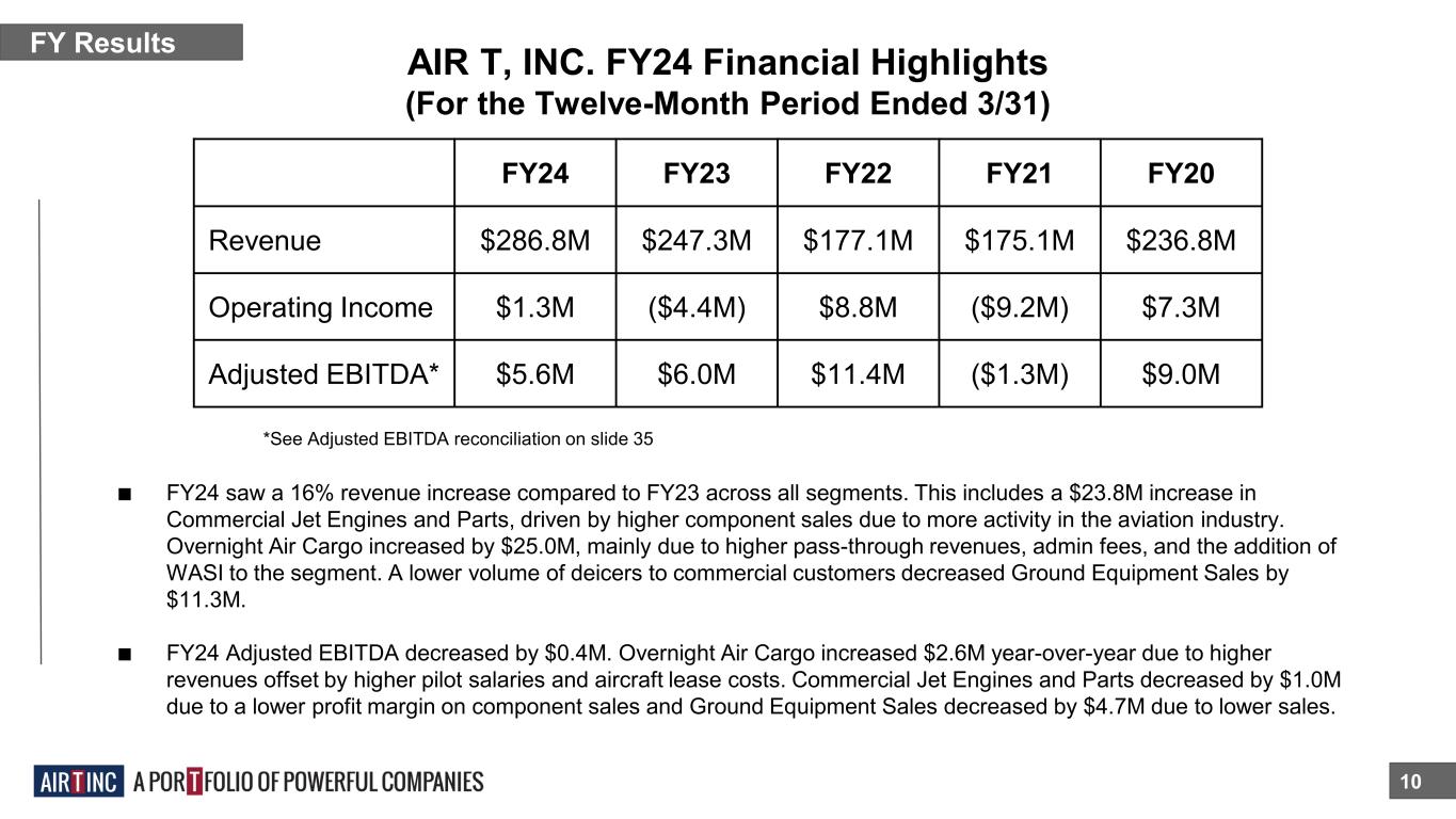 $287M 9 FY24 Revenue $5.6M FY24 Adj. EBITDA* 3 CORE SEGMENTS 14 COMPANIES 624 EMPLOYEES OVERNIGHT AIR CARGO COMMERCIAL JET ENGINES AND PARTS GROUND EQUIPMENT SALES *See Adjusted EBITDA reconciliation on slide 35