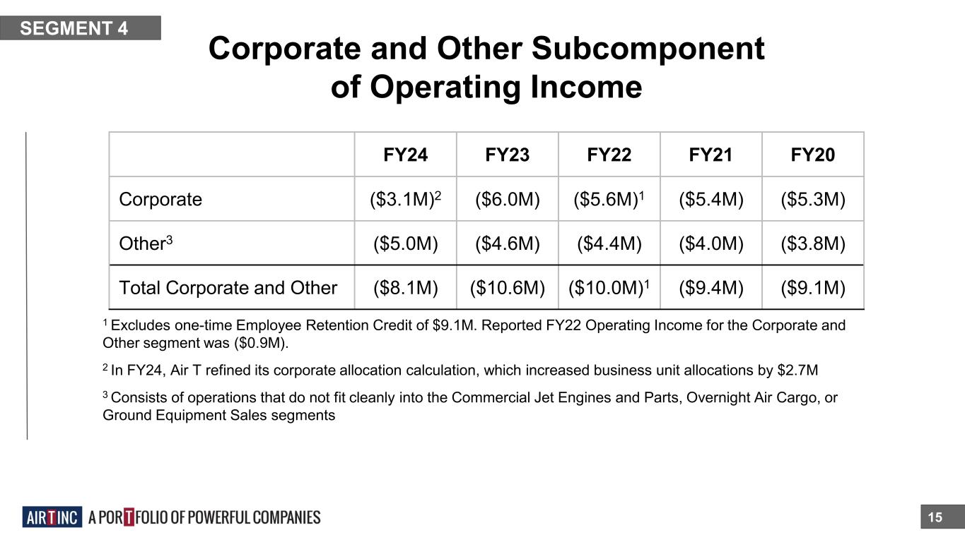 Ground Equipment Sales 14 SEGMENT 3 ■ We manufacture deicing equipment, scissor lift trucks, and other ground support equipment. ■ Sole-source deicer supplier to the US Air Force for 20 years. ■ Highly efficient light manufacturing facility. ■ The segment is comprised of Global Ground Support LLC. ■ Air T Company since 1998. ■ We believe that the decline in sales for this segment is directly attributable to a decreased demand for deicing trucks across the entire industry, driven by the recent milder winters. Segment’s order backlog was $9.1 million as of 9/30/24 compared to $7.0 million as of 9/30/23 Six-Month Period Ended 9/30 FY25 FY24 Revenue $21.8M $24.0M Adjusted EBITDA* $0.0M ($0.0M) *See Adjusted EBITDA reconciliation on slide 36