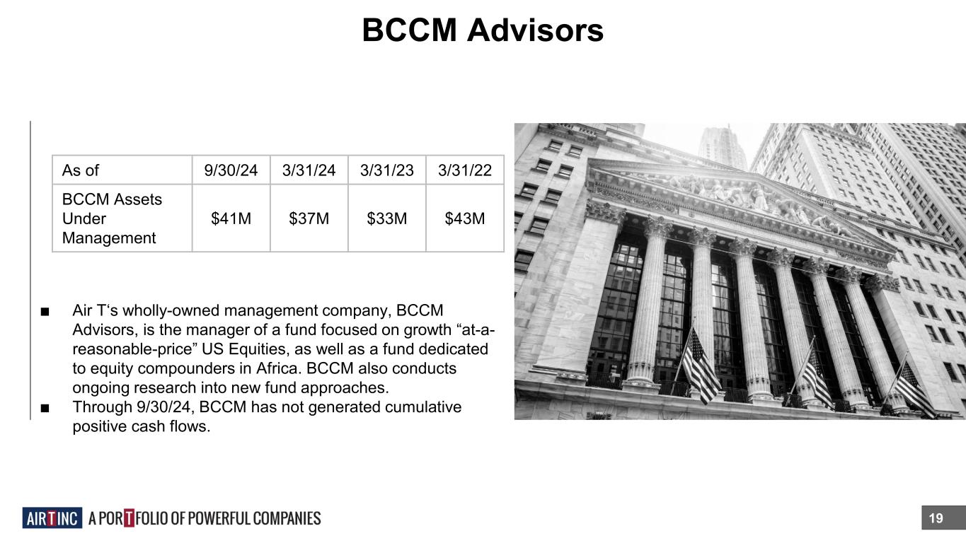 BCCM Advisors 19 ■ Air T‘s wholly-owned management company, BCCM Advisors, is the manager of a fund focused on growth “at-a- reasonable-price” US Equities, as well as a fund dedicated to equity compounders in Africa. BCCM also conducts ongoing research into new fund approaches. ■ Through 9/30/24, BCCM has not generated cumulative positive cash flows. As of 9/30/24 3/31/24 3/31/23 3/31/22 BCCM Assets Under Management $41M $37M $33M $43M