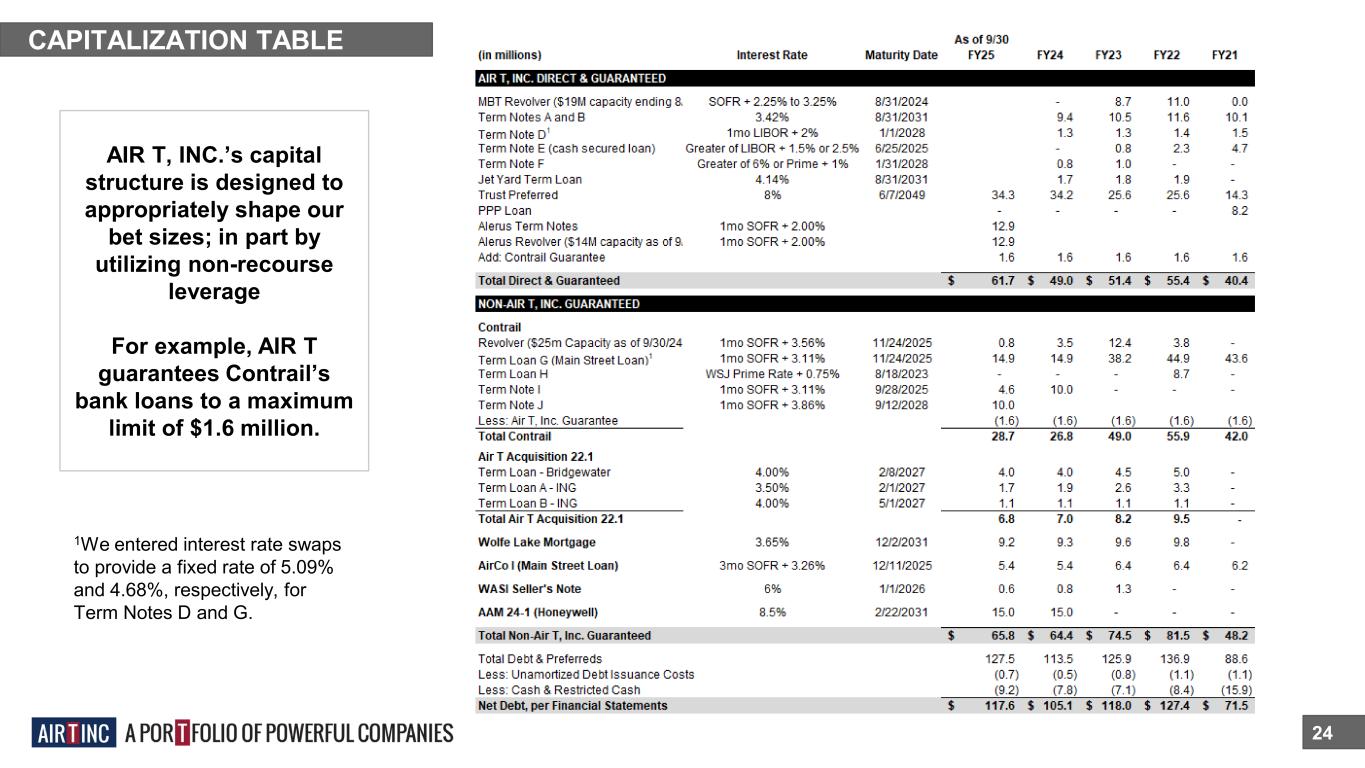 24 CAPITALIZATION TABLE AIR T, INC.’s capital structure is designed to appropriately shape our bet sizes; in part by utilizing non-recourse leverage For example, AIR T guarantees Contrail’s bank loans to a maximum limit of $1.6 million. 1We entered interest rate swaps to provide a fixed rate of 5.09% and 4.68%, respectively, for Term Notes D and G.