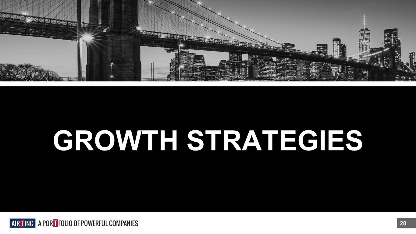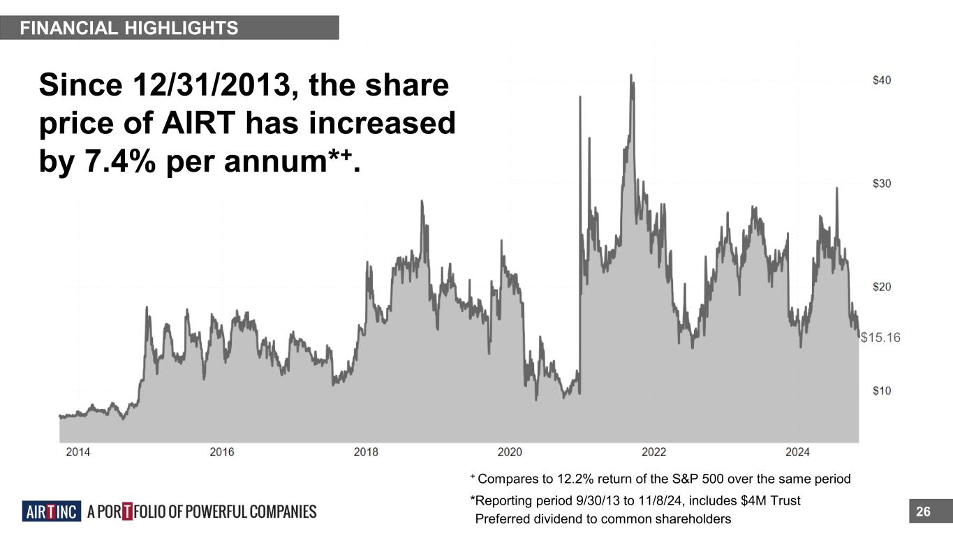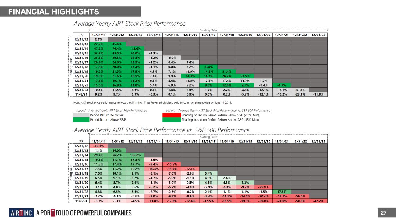 FINANCIAL HIGHLIGHTS 26 Since 12/31/2013, the share price of AIRT has increased by 7.4% per annum*+. *Reporting period 9/30/13 to 11/8/24, includes $4M Trust *Preferred dividend to common shareholders + Compares to 12.2% return of the S&P 500 over the same period $15.16