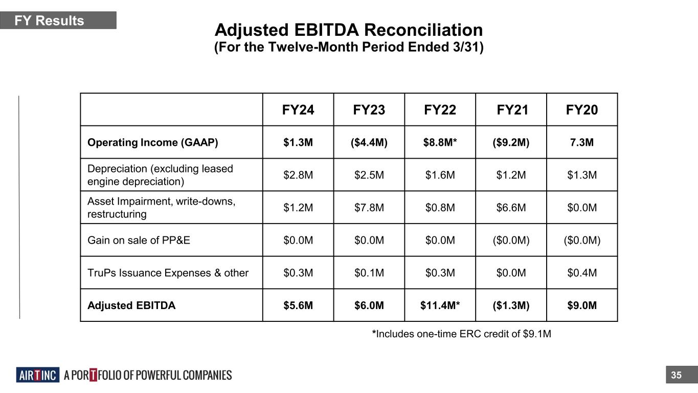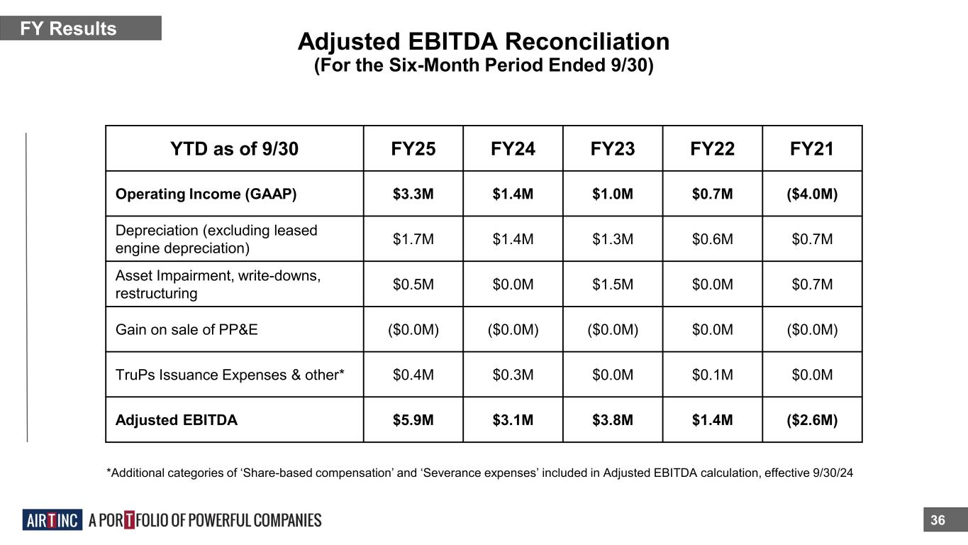 Adjusted EBITDA Reconciliation 35 FY Results *Includes one-time ERC credit of $9.1M (For the Twelve-Month Period Ended 3/31) FY24 FY23 FY22 FY21 FY20 Operating Income (GAAP) $1.3M ($4.4M) $8.8M* ($9.2M) 7.3M Depreciation (excluding leased engine depreciation) $2.8M $2.5M $1.6M $1.2M $1.3M Asset Impairment, write-downs, restructuring $1.2M $7.8M $0.8M $6.6M $0.0M Gain on sale of PP&E $0.0M $0.0M $0.0M ($0.0M) ($0.0M) TruPs Issuance Expenses & other $0.3M $0.1M $0.3M $0.0M $0.4M Adjusted EBITDA $5.6M $6.0M $11.4M* ($1.3M) $9.0M
