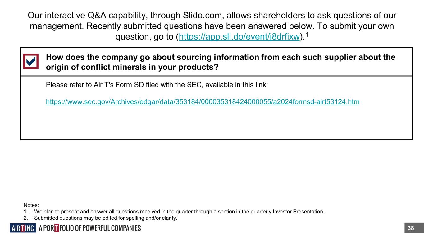 Our interactive Q&A capability, through Slido.com, allows shareholders to ask questions of our management. Recently submitted questions have been answered below. To submit your own question, go to (https://app.sli.do/event/j8drfixw).1 38 How does the company go about sourcing information from each such supplier about the origin of conflict minerals in your products? Please refer to Air T's Form SD filed with the SEC, available in this link: https://www.sec.gov/Archives/edgar/data/353184/000035318424000055/a2024formsd-airt53124.htm Notes: 1. We plan to present and answer all questions received in the quarter through a section in the quarterly Investor Presentation. 2. Submitted questions may be edited for spelling and/or clarity.