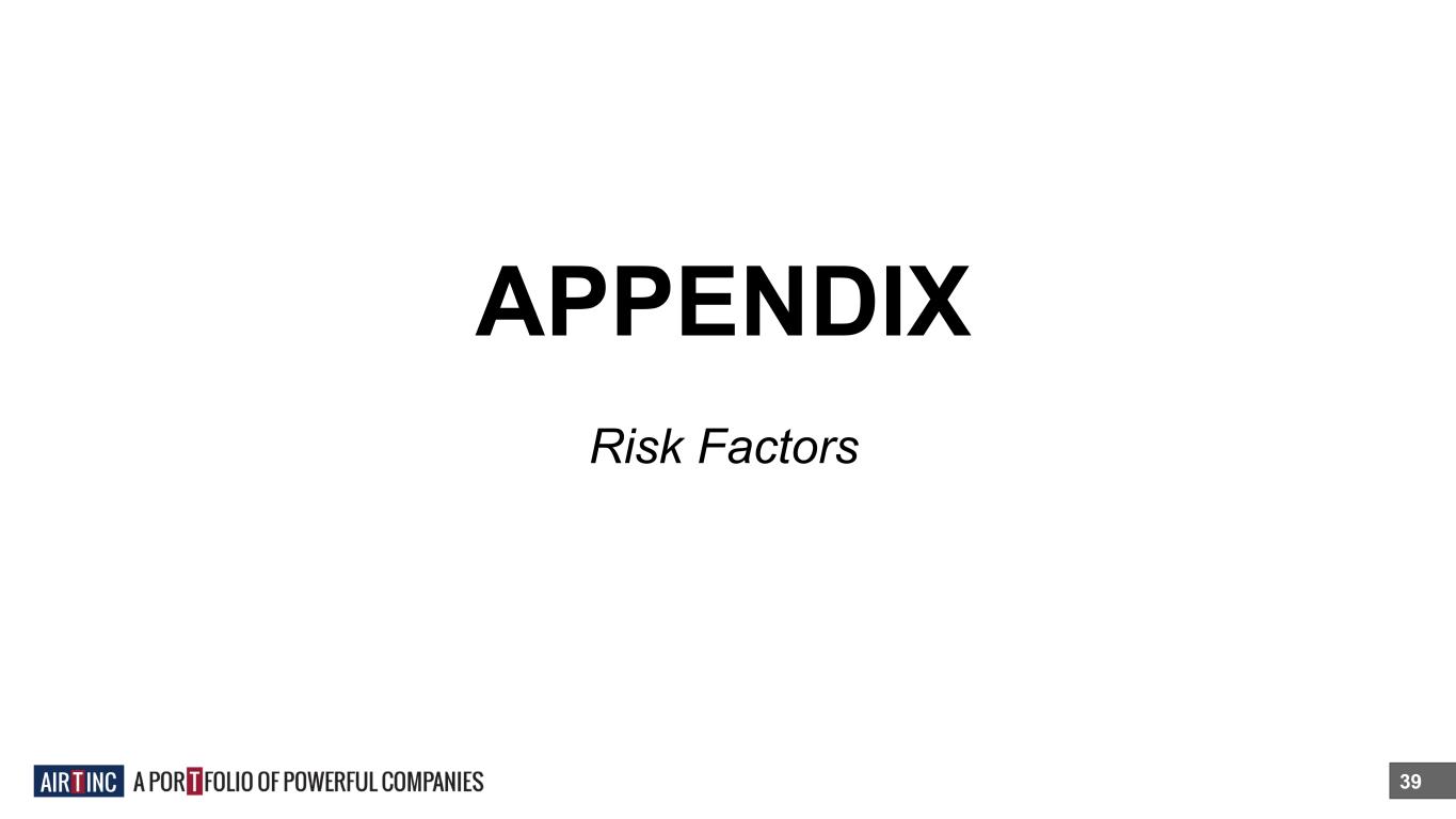 SUMMARY RISK FACTORS 40 For more detail and explanation, please see the Company’s public filings including its Form S-3 and prospectus supplements filed with the SEC. The purchase of securities of Air T, Inc., the “Company,” is highly speculative and involves a very high degree of risk. An investment in the Company is suitable only for persons who can afford the loss of their entire investment. Accordingly, in making an investment decision with respect to the Company’s securities, investors should carefully consider all material risk factors, including the risks, uncertainties and additional information set forth below as well as set forth in (i) our most recent Annual Report on Form 10-K, Quarterly Reports on Form 10-Q, Currents Reports on Form 8-K, and our definitive proxy statements, all which are filed with the SEC, and (ii) our prospectus, filed as a part of our Registration Statement on Form S-3, which is filed with the SEC, and any supplement to the prospectus, including information in any documents subsequently incorporated by reference into the prospectus. Additional risks not presently known or are currently deemed immaterial could also materially and adversely affect our financial condition, results of operations, business and prospects. General Business Risks ● Market fluctuations may affect the Company’s operations. ● Rising inflation may result in increased costs of operations and negatively impact the credit and securities markets generally, which could have a material adverse effect on our results of operations and the market price of our Securities. ● We could experience significant increases in operating costs and reduced profitability due to competition for skilled management and staff employees in our operating businesses. ● Legacy technology systems require a unique technical skillset which is becoming scarcer. ● Security threats and other sophisticated computer intrusions could harm our information systems, which in turn could harm our business and financial results. ● We may not be able to insure certain risks adequately or economically. ● Legal liability may harm our business. ● Our business might suffer if we were to lose the services of certain key employees.