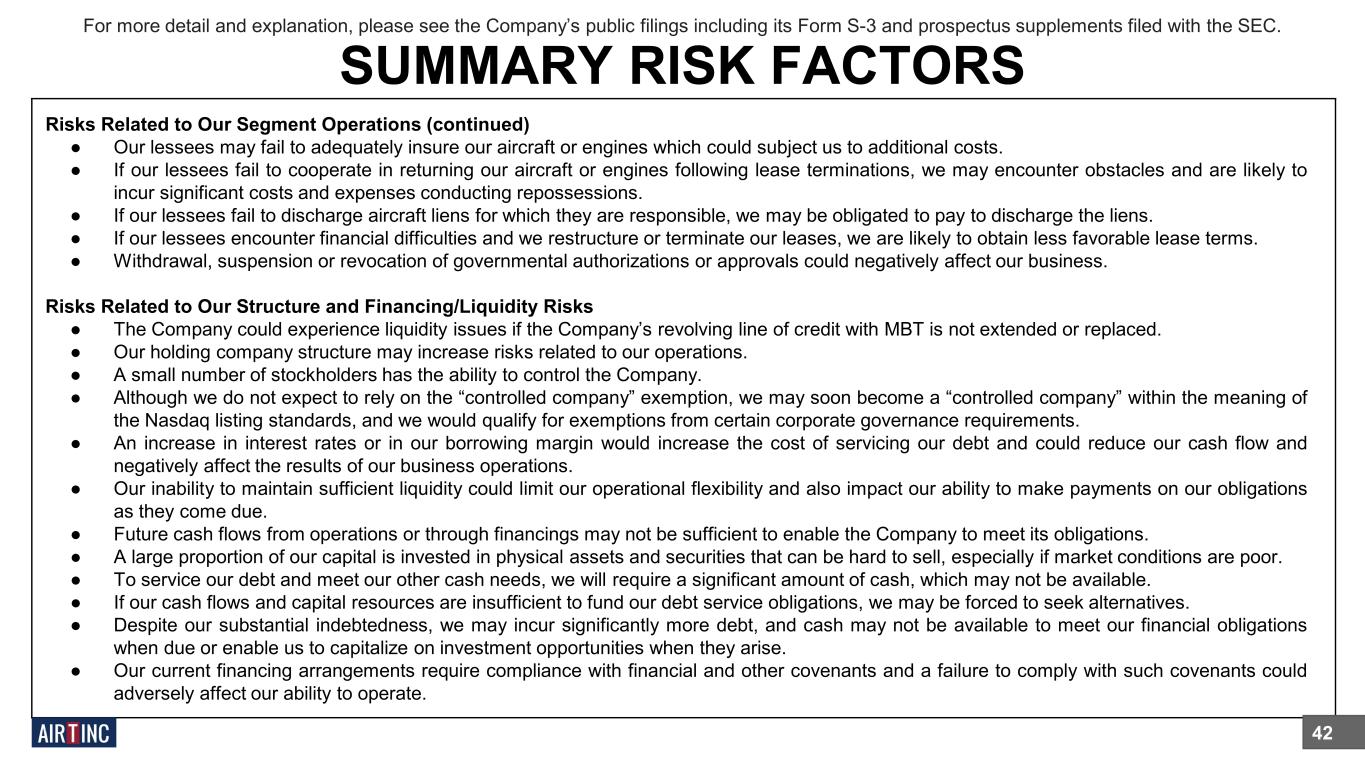 Risks Related to Our Segment Operations ● The operating results of our four segments may fluctuate, particularly our commercial jet engine and parts segment. ● Our Air Cargo Segment is dependent on a significant customer. ● Our dry-lease agreements with FedEx subject us to operating risks. ● Because of our dependence on FedEx, we are subject to the risks that may affect FedEx’s operations. ● A material reduction in the aircraft we fly for FedEx could materially adversely affect our business and results of operations. ● Sales of deicing equipment can be affected by weather conditions. ● We are affected by the risks faced by commercial aircraft operators and MRO companies because they are our customers. ● Our engine values and lease rates, which are dependent on the status of the types of aircraft on which engines are installed, and other factors, could decline. ● Upon termination of a lease, we may be unable to enter into new leases or sell the airframe, engine or its parts on acceptable terms. ● Failures by lessees to meet their maintenance and recordkeeping obligations under our leases could adversely affect the value of our leased engines and aircraft which could affect our ability to re-lease the engines and aircraft in a timely manner following termination of the leases. ● We may experience losses and delays in connection with repossession of engines or aircraft when a lessee defaults. ● Our commercial jet engine and parts segment and its customers operate in a highly regulated industry and changes in laws or regulations may adversely affect our ability to lease or sell our engines or aircraft. ● Our aircraft, engines and parts could cause damage resulting in liability claims. ● We have risks in managing our portfolio of aircraft and engines to meet customer needs. ● Liens on our engines or aircraft could exceed the value of such assets, which could negatively affect our ability to repossess, lease or sell a particular engine or aircraft. ● In certain countries, an engine affixed to an aircraft may become an addition to the aircraft and we may not be able to exercise our ownership rights over the engine. ● Higher or volatile fuel prices could affect the profitability of the aviation industry and our lessees’ ability to meet their lease payment obligations to us. ● Interruptions in the capital markets could impair our lessees’ ability to finance their operations, which could prevent the lessees from complying with payment obligations to us. For more detail and explanation, please see the Company’s public filings including its Form S-3 and prospectus supplements filed with the SEC. SUMMARY RISK FACTORS 41
