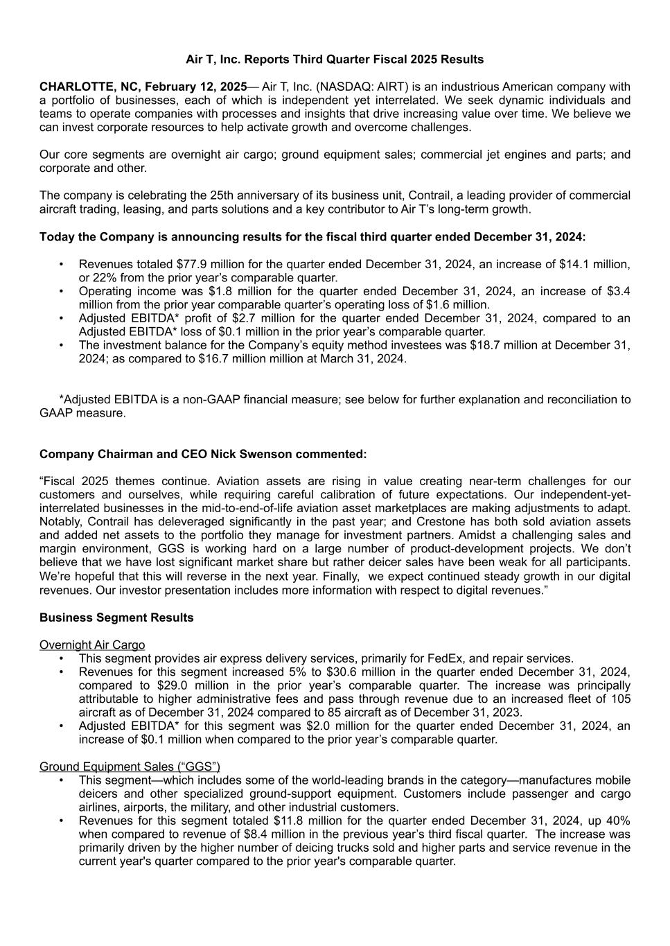 Air T, Inc. Reports Third Quarter Fiscal 2025 Results CHARLOTTE, NC, February 12, 2025— Air T, Inc. (NASDAQ: AIRT) is an industrious American company with a portfolio of businesses, each of which is independent yet interrelated. We seek dynamic individuals and teams to operate companies with processes and insights that drive increasing value over time. We believe we can invest corporate resources to help activate growth and overcome challenges. Our core segments are overnight air cargo; ground equipment sales; commercial jet engines and parts; and corporate and other. The company is celebrating the 25th anniversary of its business unit, Contrail, a leading provider of commercial aircraft trading, leasing, and parts solutions and a key contributor to Air T’s long-term growth. Today the Company is announcing results for the fiscal third quarter ended December 31, 2024: • Revenues totaled $77.9 million for the quarter ended December 31, 2024, an increase of $14.1 million, or 22% from the prior year’s comparable quarter. • Operating income was $1.8 million for the quarter ended December 31, 2024, an increase of $3.4 million from the prior year comparable quarter’s operating loss of $1.6 million. • Adjusted EBITDA* profit of $2.7 million for the quarter ended December 31, 2024, compared to an Adjusted EBITDA* loss of $0.1 million in the prior year’s comparable quarter. • The investment balance for the Company’s equity method investees was $18.7 million at December 31, 2024; as compared to $16.7 million million at March 31, 2024. *Adjusted EBITDA is a non-GAAP financial measure; see below for further explanation and reconciliation to GAAP measure. Company Chairman and CEO Nick Swenson commented: “Fiscal 2025 themes continue. Aviation assets are rising in value creating near-term challenges for our customers and ourselves, while requiring careful calibration of future expectations. Our independent-yet- interrelated businesses in the mid-to-end-of-life aviation asset marketplaces are making adjustments to adapt. Notably, Contrail has deleveraged significantly in the past year; and Crestone has both sold aviation assets and added net assets to the portfolio they manage for investment partners. Amidst a challenging sales and margin environment, GGS is working hard on a large number of product-development projects. We don’t believe that we have lost significant market share but rather deicer sales have been weak for all participants. We’re hopeful that this will reverse in the next year. Finally, we expect continued steady growth in our digital revenues. Our investor presentation includes more information with respect to digital revenues.” Business Segment Results Overnight Air Cargo • This segment provides air express delivery services, primarily for FedEx, and repair services. • Revenues for this segment increased 5% to $30.6 million in the quarter ended December 31, 2024, compared to $29.0 million in the prior year’s comparable quarter. The increase was principally attributable to higher administrative fees and pass through revenue due to an increased fleet of 105 aircraft as of December 31, 2024 compared to 85 aircraft as of December 31, 2023. • Adjusted EBITDA* for this segment was $2.0 million for the quarter ended December 31, 2024, an increase of $0.1 million when compared to the prior year’s comparable quarter. Ground Equipment Sales (“GGS”) • This segment—which includes some of the world-leading brands in the category—manufactures mobile deicers and other specialized ground-support equipment. Customers include passenger and cargo airlines, airports, the military, and other industrial customers. • Revenues for this segment totaled $11.8 million for the quarter ended December 31, 2024, up 40% when compared to revenue of $8.4 million in the previous year’s third fiscal quarter. The increase was primarily driven by the higher number of deicing trucks sold and higher parts and service revenue in the current year's quarter compared to the prior year's comparable quarter.