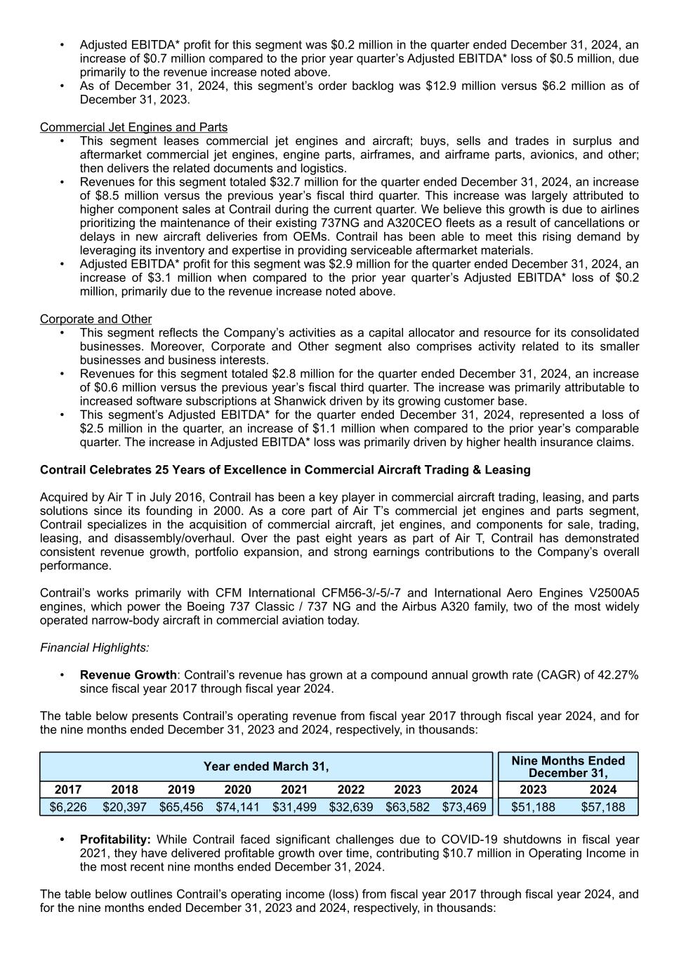 • Adjusted EBITDA* profit for this segment was $0.2 million in the quarter ended December 31, 2024, an increase of $0.7 million compared to the prior year quarter’s Adjusted EBITDA* loss of $0.5 million, due primarily to the revenue increase noted above. • As of December 31, 2024, this segment’s order backlog was $12.9 million versus $6.2 million as of December 31, 2023. Commercial Jet Engines and Parts • This segment leases commercial jet engines and aircraft; buys, sells and trades in surplus and aftermarket commercial jet engines, engine parts, airframes, and airframe parts, avionics, and other; then delivers the related documents and logistics. • Revenues for this segment totaled $32.7 million for the quarter ended December 31, 2024, an increase of $8.5 million versus the previous year’s fiscal third quarter. This increase was largely attributed to higher component sales at Contrail during the current quarter. We believe this growth is due to airlines prioritizing the maintenance of their existing 737NG and A320CEO fleets as a result of cancellations or delays in new aircraft deliveries from OEMs. Contrail has been able to meet this rising demand by leveraging its inventory and expertise in providing serviceable aftermarket materials. • Adjusted EBITDA* profit for this segment was $2.9 million for the quarter ended December 31, 2024, an increase of $3.1 million when compared to the prior year quarter’s Adjusted EBITDA* loss of $0.2 million, primarily due to the revenue increase noted above. Corporate and Other • This segment reflects the Company’s activities as a capital allocator and resource for its consolidated businesses. Moreover, Corporate and Other segment also comprises activity related to its smaller businesses and business interests. • Revenues for this segment totaled $2.8 million for the quarter ended December 31, 2024, an increase of $0.6 million versus the previous year’s fiscal third quarter. The increase was primarily attributable to increased software subscriptions at Shanwick driven by its growing customer base. • This segment’s Adjusted EBITDA* for the quarter ended December 31, 2024, represented a loss of $2.5 million in the quarter, an increase of $1.1 million when compared to the prior year’s comparable quarter. The increase in Adjusted EBITDA* loss was primarily driven by higher health insurance claims. Contrail Celebrates 25 Years of Excellence in Commercial Aircraft Trading & Leasing Acquired by Air T in July 2016, Contrail has been a key player in commercial aircraft trading, leasing, and parts solutions since its founding in 2000. As a core part of Air T’s commercial jet engines and parts segment, Contrail specializes in the acquisition of commercial aircraft, jet engines, and components for sale, trading, leasing, and disassembly/overhaul. Over the past eight years as part of Air T, Contrail has demonstrated consistent revenue growth, portfolio expansion, and strong earnings contributions to the Company’s overall performance. Contrail’s works primarily with CFM International CFM56-3/-5/-7 and International Aero Engines V2500A5 engines, which power the Boeing 737 Classic / 737 NG and the Airbus A320 family, two of the most widely operated narrow-body aircraft in commercial aviation today. Financial Highlights: • Revenue Growth: Contrail’s revenue has grown at a compound annual growth rate (CAGR) of 42.27% since fiscal year 2017 through fiscal year 2024. The table below presents Contrail’s operating revenue from fiscal year 2017 through fiscal year 2024, and for the nine months ended December 31, 2023 and 2024, respectively, in thousands: Year ended March 31, Nine Months Ended December 31, 2017 2018 2019 2020 2021 2022 2023 2024 2023 2024 $6,226 $20,397 $65,456 $74,141 $31,499 $32,639 $63,582 $73,469 $51,188 $57,188 • Profitability: While Contrail faced significant challenges due to COVID-19 shutdowns in fiscal year 2021, they have delivered profitable growth over time, contributing $10.7 million in Operating Income in the most recent nine months ended December 31, 2024. The table below outlines Contrail’s operating income (loss) from fiscal year 2017 through fiscal year 2024, and for the nine months ended December 31, 2023 and 2024, respectively, in thousands: