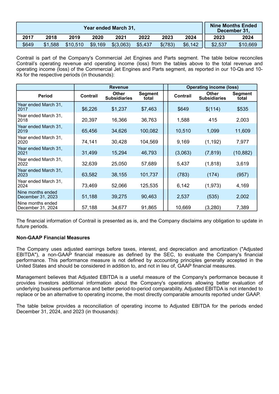 Year ended March 31, Nine Months Ended December 31, 2017 2018 2019 2020 2021 2022 2023 2024 2023 2024 $649 $1,588 $10,510 $9,169 $(3,063) $5,437 $(783) $6,142 $2,537 $10,669 Contrail is part of the Company's Commercial Jet Engines and Parts segment. The table below reconciles Contrail’s operating revenue and operating income (loss) from the tables above to the total revenue and operating income (loss) of the Commercial Jet Engines and Parts segment, as reported in our 10-Qs and 10- Ks for the respective periods (in thousands): Revenue Operating income (loss) Period Contrail Other Subsidiaries Segment total Contrail Other Subsidiaries Segment total Year ended March 31, 2017 $6,226 $1,237 $7,463 $649 $(114) $535 Year ended March 31, 2018 20,397 16,366 36,763 1,588 415 2,003 Year ended March 31, 2019 65,456 34,626 100,082 10,510 1,099 11,609 Year ended March 31, 2020 74,141 30,428 104,569 9,169 (1,192) 7,977 Year ended March 31, 2021 31,499 15,294 46,793 (3,063) (7,819) (10,882) Year ended March 31, 2022 32,639 25,050 57,689 5,437 (1,818) 3,619 Year ended March 31, 2023 63,582 38,155 101,737 (783) (174) (957) Year ended March 31, 2024 73,469 52,066 125,535 6,142 (1,973) 4,169 Nine months ended December 31, 2023 51,188 39,275 90,463 2,537 (535) 2,002 Nine months ended December 31, 2024 57,188 34,677 91,865 10,669 (3,280) 7,389 The financial information of Contrail is presented as is, and the Company disclaims any obligation to update in future periods. Non-GAAP Financial Measures The Company uses adjusted earnings before taxes, interest, and depreciation and amortization ("Adjusted EBITDA"), a non-GAAP financial measure as defined by the SEC, to evaluate the Company's financial performance. This performance measure is not defined by accounting principles generally accepted in the United States and should be considered in addition to, and not in lieu of, GAAP financial measures. Management believes that Adjusted EBITDA is a useful measure of the Company's performance because it provides investors additional information about the Company's operations allowing better evaluation of underlying business performance and better period-to-period comparability. Adjusted EBITDA is not intended to replace or be an alternative to operating income, the most directly comparable amounts reported under GAAP. The table below provides a reconciliation of operating income to Adjusted EBITDA for the periods ended December 31, 2024, and 2023 (in thousands):