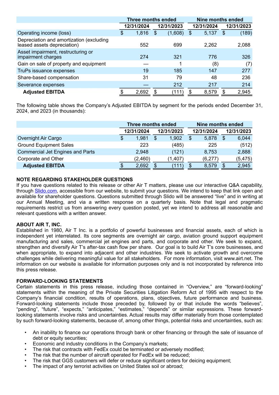 Three months ended Nine months ended 12/31/2024 12/31/2023 12/31/2024 12/31/2023 Operating income (loss) $ 1,816 $ (1,608) $ 5,137 $ (189) Depreciation and amortization (excluding leased assets depreciation) 552 699 2,262 2,088 Asset impairment, restructuring or impairment charges 274 321 776 326 Gain on sale of property and equipment — 1 (8) (7) TruPs issuance expenses 19 185 147 277 Share-based compensation 31 79 48 236 Severance expenses — 212 217 214 Adjusted EBITDA $ 2,692 $ (111) $ 8,579 $ 2,945 The following table shows the Company’s Adjusted EBITDA by segment for the periods ended December 31, 2024, and 2023 (in thousands): Three months ended Nine months ended 12/31/2024 12/31/2023 12/31/2024 12/31/2023 Overnight Air Cargo $ 1,981 $ 1,902 $ 5,878 $ 6,044 Ground Equipment Sales 223 (485) 225 (512) Commercial Jet Engines and Parts 2,948 (121) 8,753 2,888 Corporate and Other (2,460) (1,407) (6,277) (5,475) Adjusted EBITDA $ 2,692 $ (111) $ 8,579 $ 2,945 NOTE REGARDING STAKEHOLDER QUESTIONS If you have questions related to this release or other Air T matters, please use our interactive Q&A capability, through Slido.com, accessible from our website, to submit your questions. We intend to keep that link open and available for shareholder questions. Questions submitted through Slido will be answered “live” and in writing at our Annual Meeting, and via a written response on a quarterly basis. Note that legal and pragmatic requirements restrict us from answering every question posted, yet we intend to address all reasonable and relevant questions with a written answer. ABOUT AIR T, INC. Established in 1980, Air T Inc. is a portfolio of powerful businesses and financial assets, each of which is independent yet interrelated. Its core segments are overnight air cargo, aviation ground support equipment manufacturing and sales, commercial jet engines and parts, and corporate and other. We seek to expand, strengthen and diversify Air T’s after-tax cash flow per share. Our goal is to build Air T’s core businesses, and when appropriate, to expand into adjacent and other industries. We seek to activate growth and overcome challenges while delivering meaningful value for all stakeholders. For more information, visit www.airt.net. The information on our website is available for information purposes only and is not incorporated by reference into this press release. FORWARD-LOOKING STATEMENTS Certain statements in this press release, including those contained in “Overview,” are “forward-looking” statements within the meaning of the Private Securities Litigation Reform Act of 1995 with respect to the Company’s financial condition, results of operations, plans, objectives, future performance and business. Forward-looking statements include those preceded by, followed by or that include the words “believes”, “pending”, “future”, “expects,” “anticipates,” “estimates,” “depends” or similar expressions. These forward- looking statements involve risks and uncertainties. Actual results may differ materially from those contemplated by such forward-looking statements, because of, among other things, potential risks and uncertainties, such as: • An inability to finance our operations through bank or other financing or through the sale of issuance of debt or equity securities; • Economic and industry conditions in the Company’s markets; • The risk that contracts with FedEx could be terminated or adversely modified; • The risk that the number of aircraft operated for FedEx will be reduced; • The risk that GGS customers will defer or reduce significant orders for deicing equipment; • The impact of any terrorist activities on United States soil or abroad;