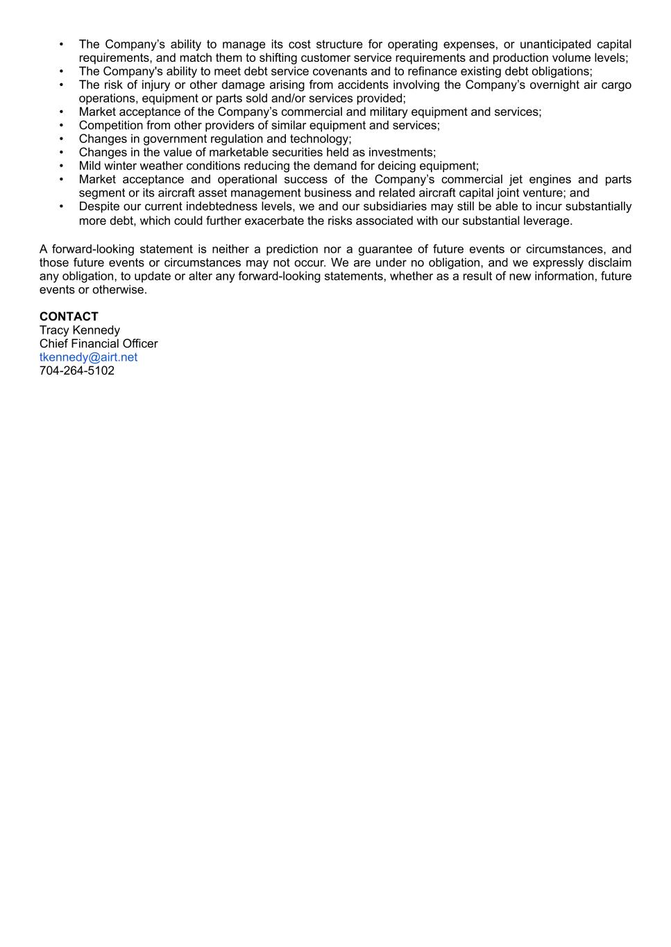 • The Company’s ability to manage its cost structure for operating expenses, or unanticipated capital requirements, and match them to shifting customer service requirements and production volume levels; • The Company's ability to meet debt service covenants and to refinance existing debt obligations; • The risk of injury or other damage arising from accidents involving the Company’s overnight air cargo operations, equipment or parts sold and/or services provided; • Market acceptance of the Company’s commercial and military equipment and services; • Competition from other providers of similar equipment and services; • Changes in government regulation and technology; • Changes in the value of marketable securities held as investments; • Mild winter weather conditions reducing the demand for deicing equipment; • Market acceptance and operational success of the Company’s commercial jet engines and parts segment or its aircraft asset management business and related aircraft capital joint venture; and • Despite our current indebtedness levels, we and our subsidiaries may still be able to incur substantially more debt, which could further exacerbate the risks associated with our substantial leverage. A forward-looking statement is neither a prediction nor a guarantee of future events or circumstances, and those future events or circumstances may not occur. We are under no obligation, and we expressly disclaim any obligation, to update or alter any forward-looking statements, whether as a result of new information, future events or otherwise. CONTACT Tracy Kennedy Chief Financial Officer tkennedy@airt.net 704-264-5102