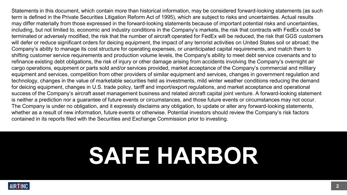 Statements in this document, which contain more than historical information, may be considered forward-looking statements (as such term is defined in the Private Securities Litigation Reform Act of 1995), which are subject to risks and uncertainties. Actual results may differ materially from those expressed in the forward-looking statements because of important potential risks and uncertainties, including, but not limited to, economic and industry conditions in the Company’s markets, the risk that contracts with FedEx could be terminated or adversely modified, the risk that the number of aircraft operated for FedEx will be reduced, the risk that GGS customers will defer or reduce significant orders for deicing equipment, the impact of any terrorist activities on United States soil or abroad; the Company’s ability to manage its cost structure for operating expenses, or unanticipated capital requirements, and match them to shifting customer service requirements and production volume levels, the Company's ability to meet debt service covenants and to refinance existing debt obligations, the risk of injury or other damage arising from accidents involving the Company’s overnight air cargo operations, equipment or parts sold and/or services provided, market acceptance of the Company’s commercial and military equipment and services, competition from other providers of similar equipment and services, changes in government regulation and technology, changes in the value of marketable securities held as investments, mild winter weather conditions reducing the demand for deicing equipment, changes in U.S. trade policy, tariff and import/export regulations, and market acceptance and operational success of the Company’s aircraft asset management business and related aircraft capital joint venture. A forward-looking statement is neither a prediction nor a guarantee of future events or circumstances, and those future events or circumstances may not occur. The Company is under no obligation, and it expressly disclaims any obligation, to update or alter any forward-looking statements, whether as a result of new information, future events or otherwise. Potential investors should review the Company’s risk factors contained in its reports filed with the Securities and Exchange Commission prior to investing. 2 SAFE HARBOR