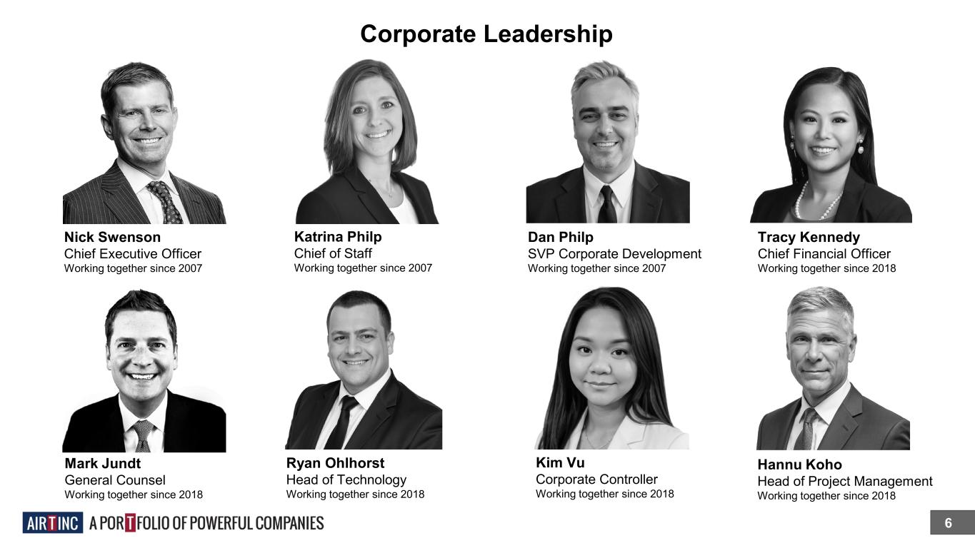 Organizational Design 5 Air T is a decentralized portfolio of responsible and autonomous businesses — each of which is independent yet interrelated. Air T finds, develops, and focuses resources to activate growth and overcome challenges. Air T makes space for dynamos and dynamic teams. Air T is an allocator-operator partnership.