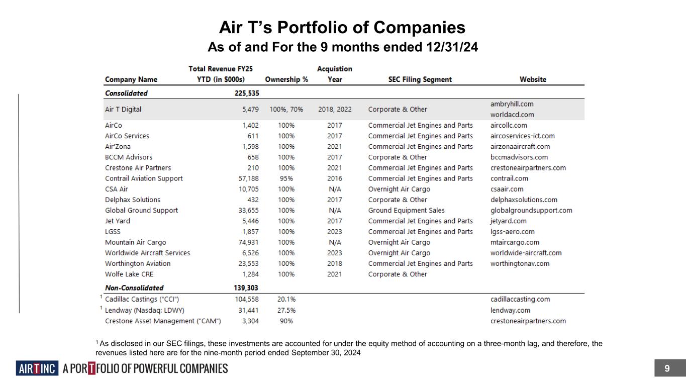 Air T’s Portfolio of Companies 9 As of and For the 9 months ended 12/31/24 1 As disclosed in our SEC filings, these investments are accounted for under the equity method of accounting on a three-month lag, and therefore, the revenues listed here are for the nine-month period ended September 30, 2024